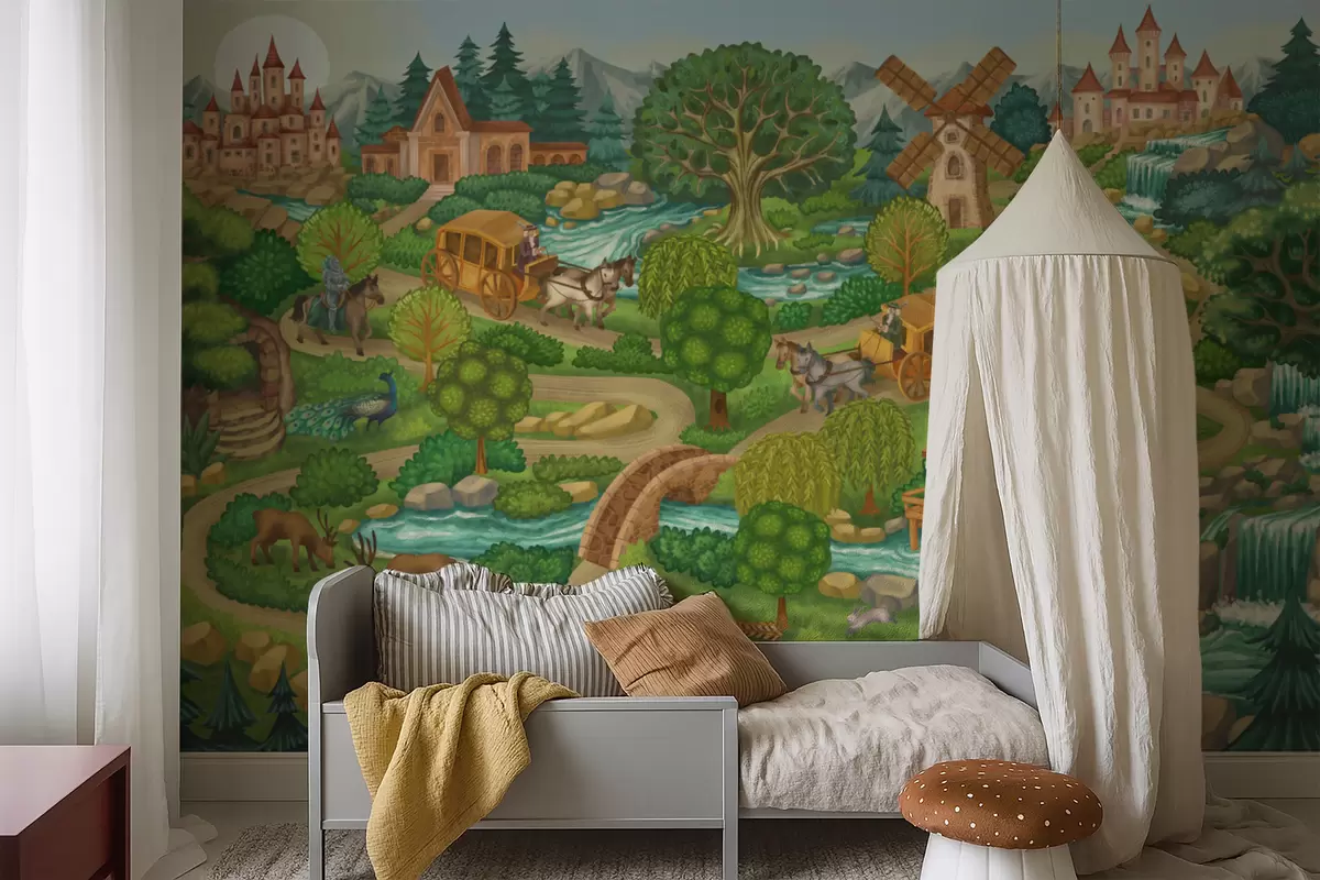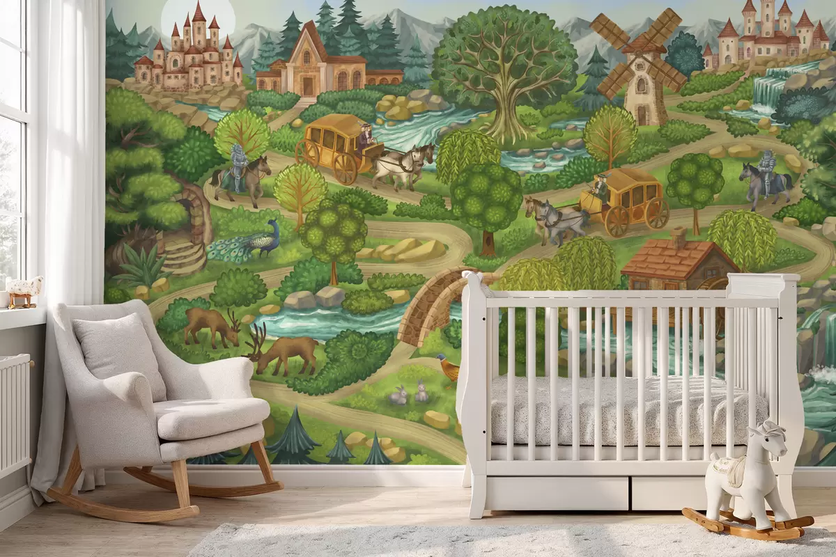 Valokuvatapetti Keijukuvitus, jossa on linnoja, metsiä, jokia ja matkailijoita Nr w05091v1