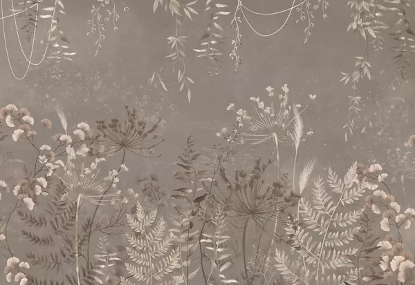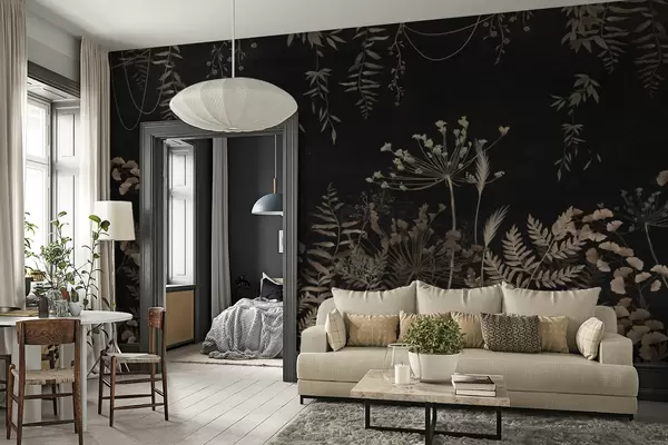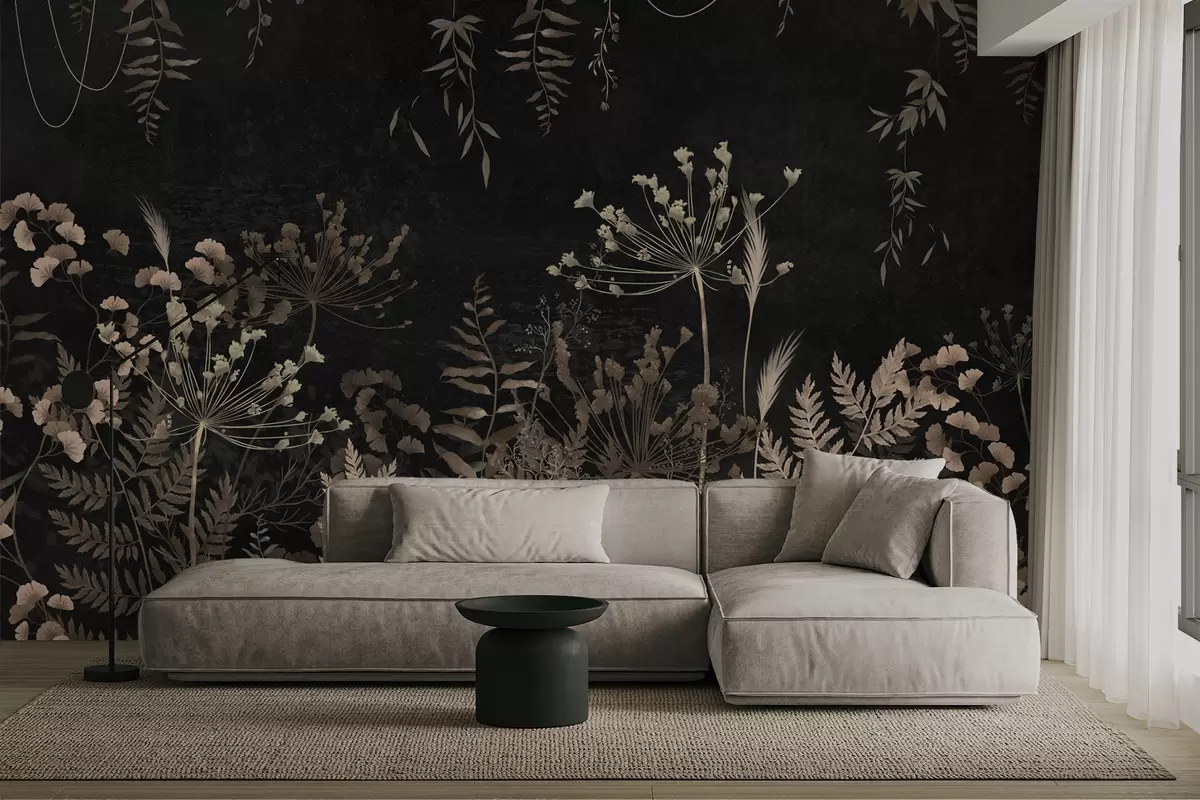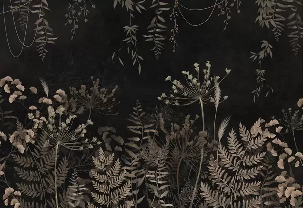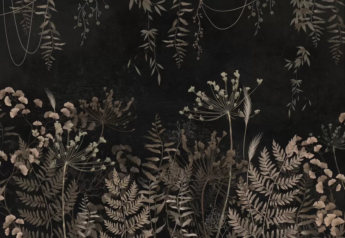 Valokuvatapetti Tumma kasvitieteellinen kuvio, jossa on kukkia ja lehtiä Nr w05092