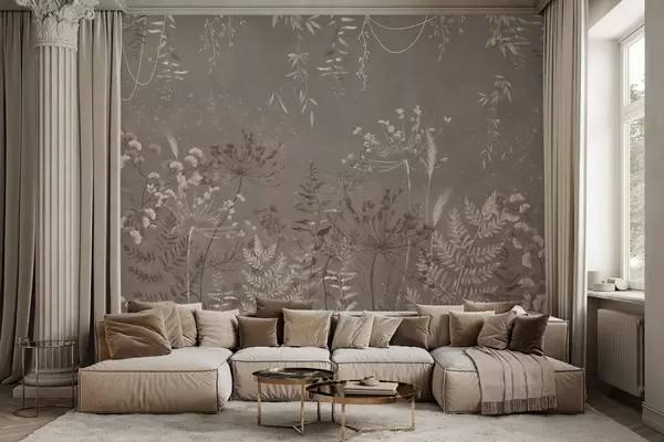 Valokuvatapetti Kevyt kasvitunnus, jossa kukkia ja lehtiä Nr w05092v1