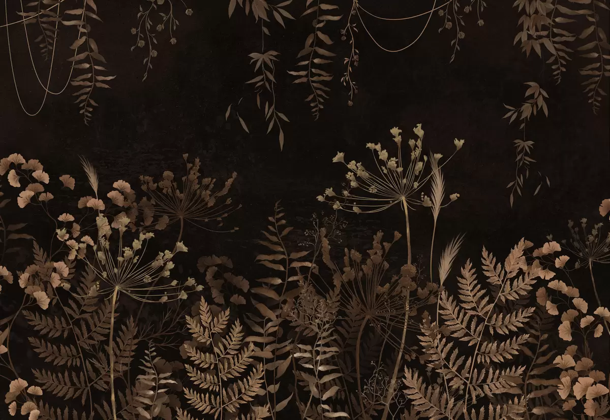Valokuvatapetti Tumma kasvitieteellinen kuvio, jossa on kukkia ja ruohoa Nr w05092v3