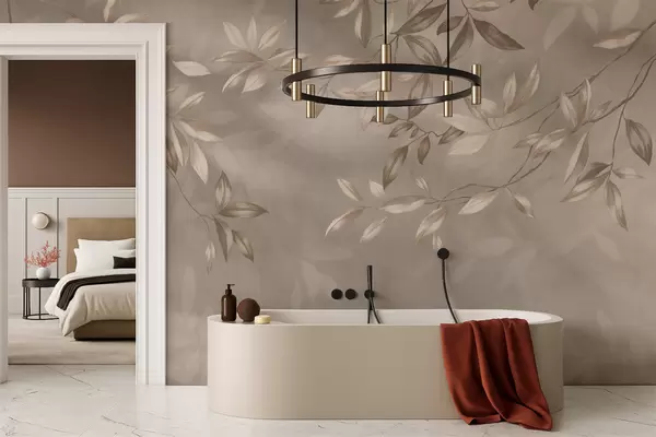 Valokuvatapetti Elegantit lehtiset oksat beigeissä sävyissä vaalealla taustalla Nr w05113