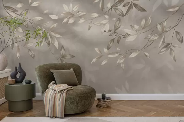 Valokuvatapetti Elegantit lehtiset oksat beigeissä sävyissä vaalealla taustalla Nr w05113