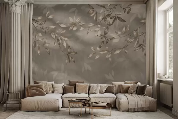 Valokuvatapetti Hienostuneet, beigeä sävyiset lehtiset oksat vaalealla taustalla Nr w05113v2
