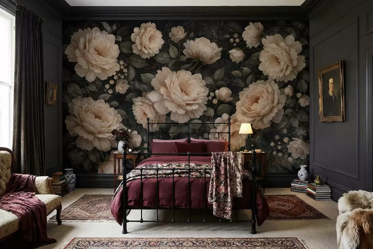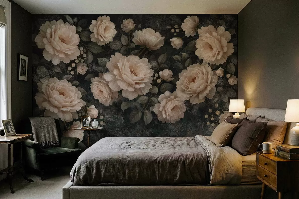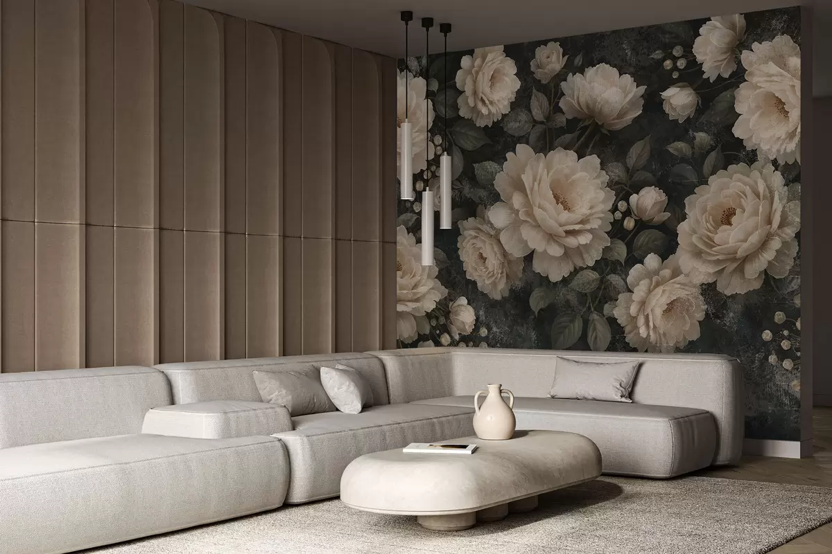 Valokuvatapetti Beigen sävyiset, runsaslukuinen kukat tummalla taustalla Nr w05114