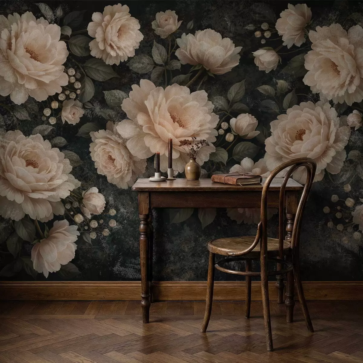 Valokuvatapetti Beigen sävyiset, runsaslukuinen kukat tummalla taustalla Nr w05114