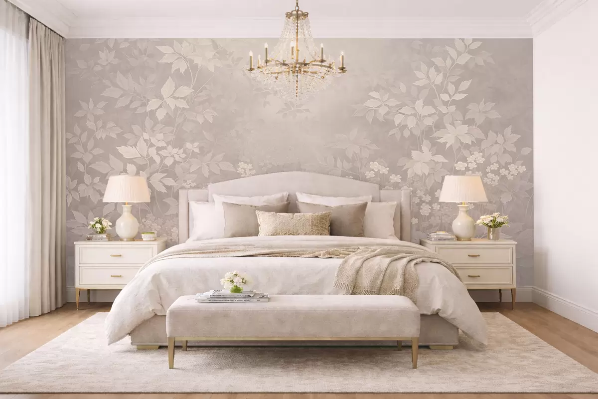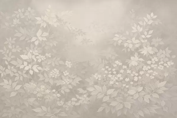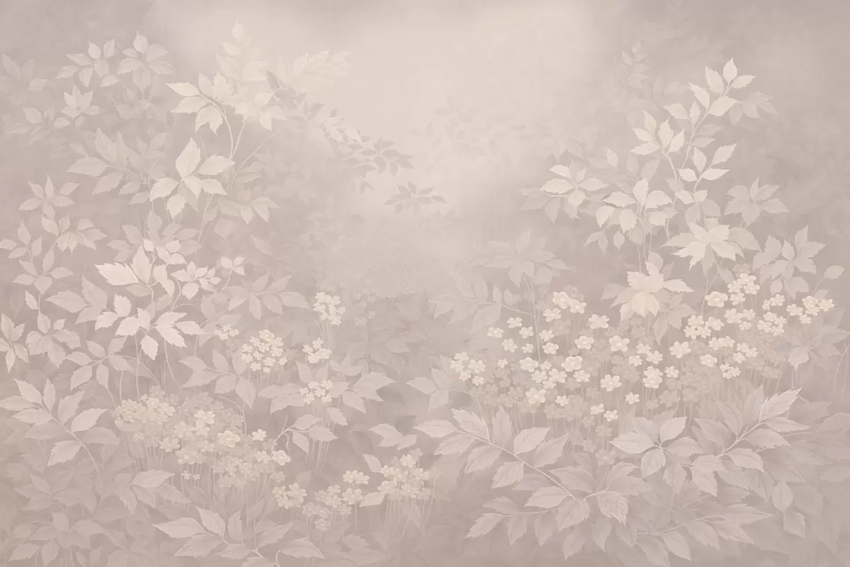 Valokuvatapetti Kevyt kasvitieteellinen koriste, jossa on lehtiä ja pieniä kukkia Nr w05115