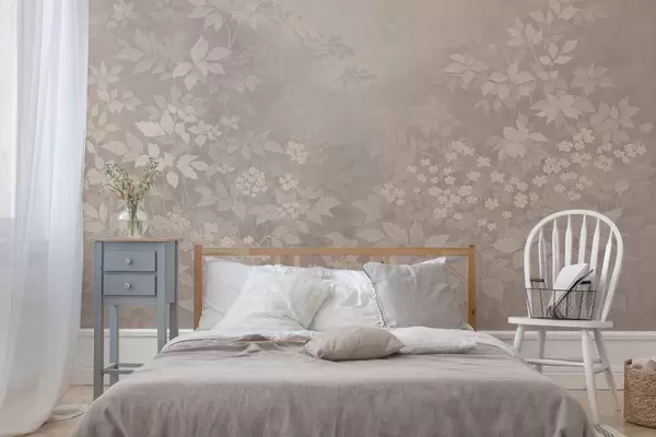 Valokuvatapetti Kevyt kasvitieteellinen koriste, jossa on lehtiä ja pieniä kukkia Nr w05115