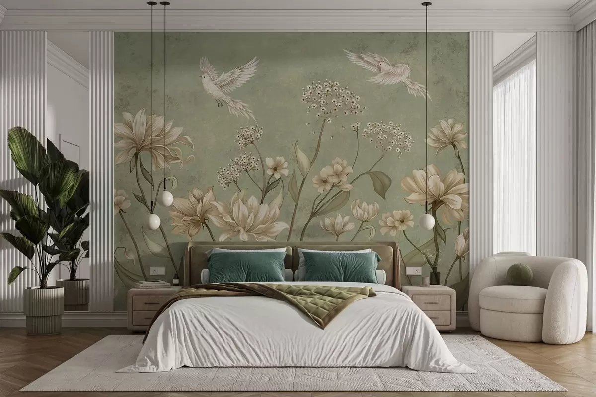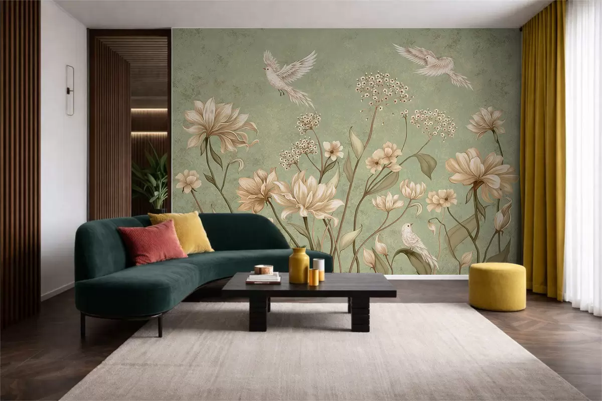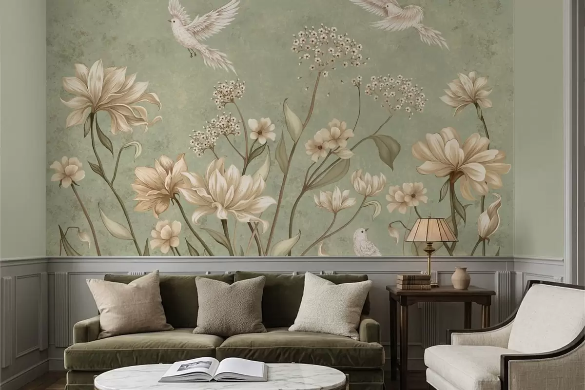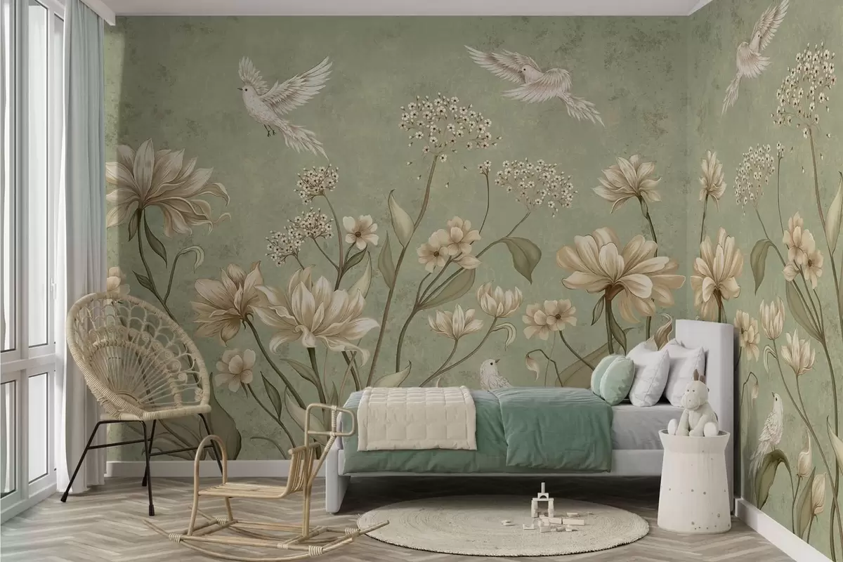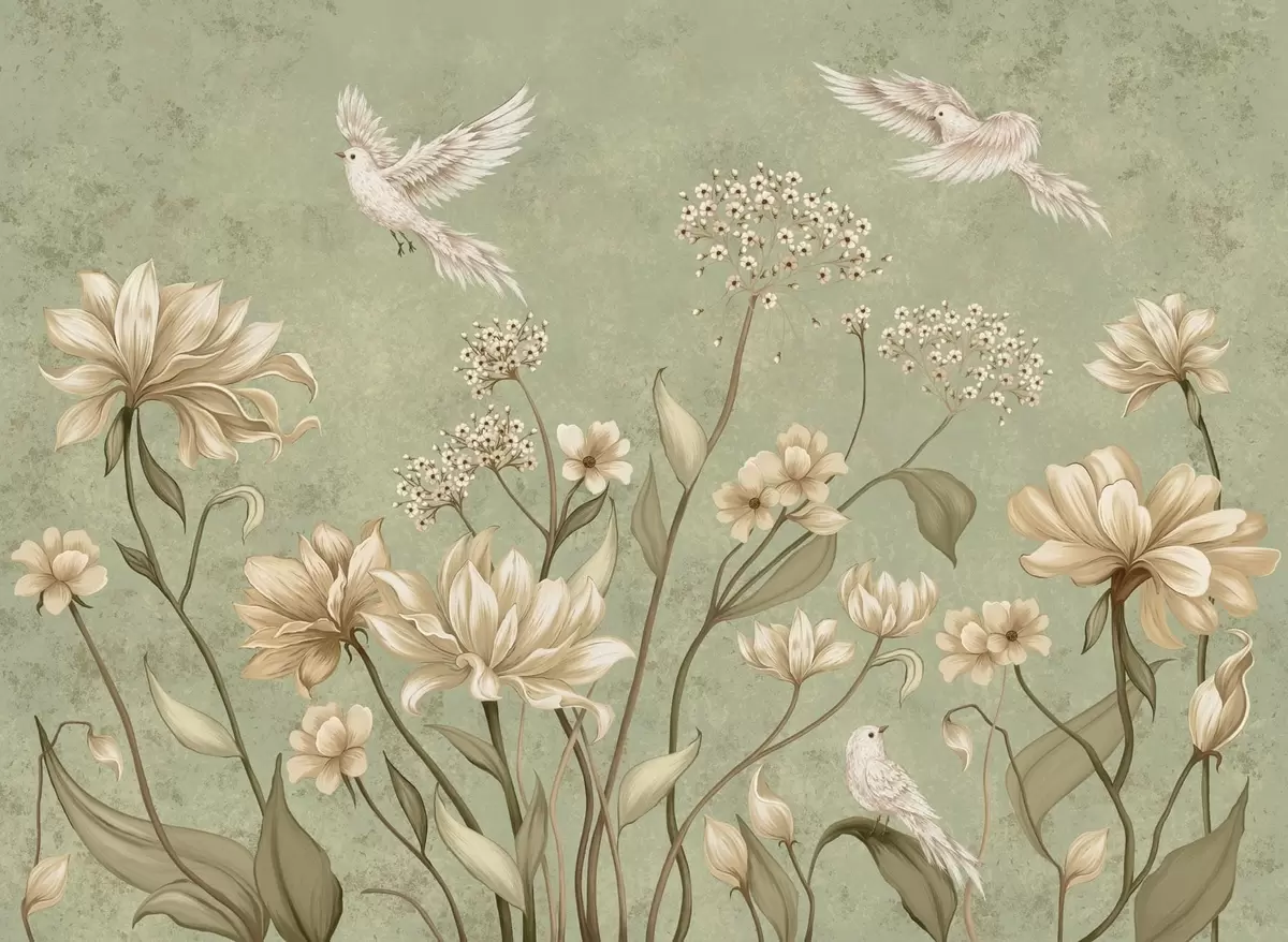 Valokuvatapetti Kukkia ja lintuja vihreällä, kuvioidulla taustalla Nr w05118v1