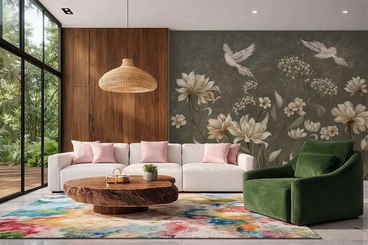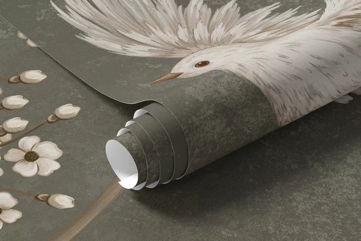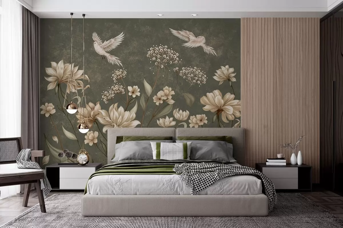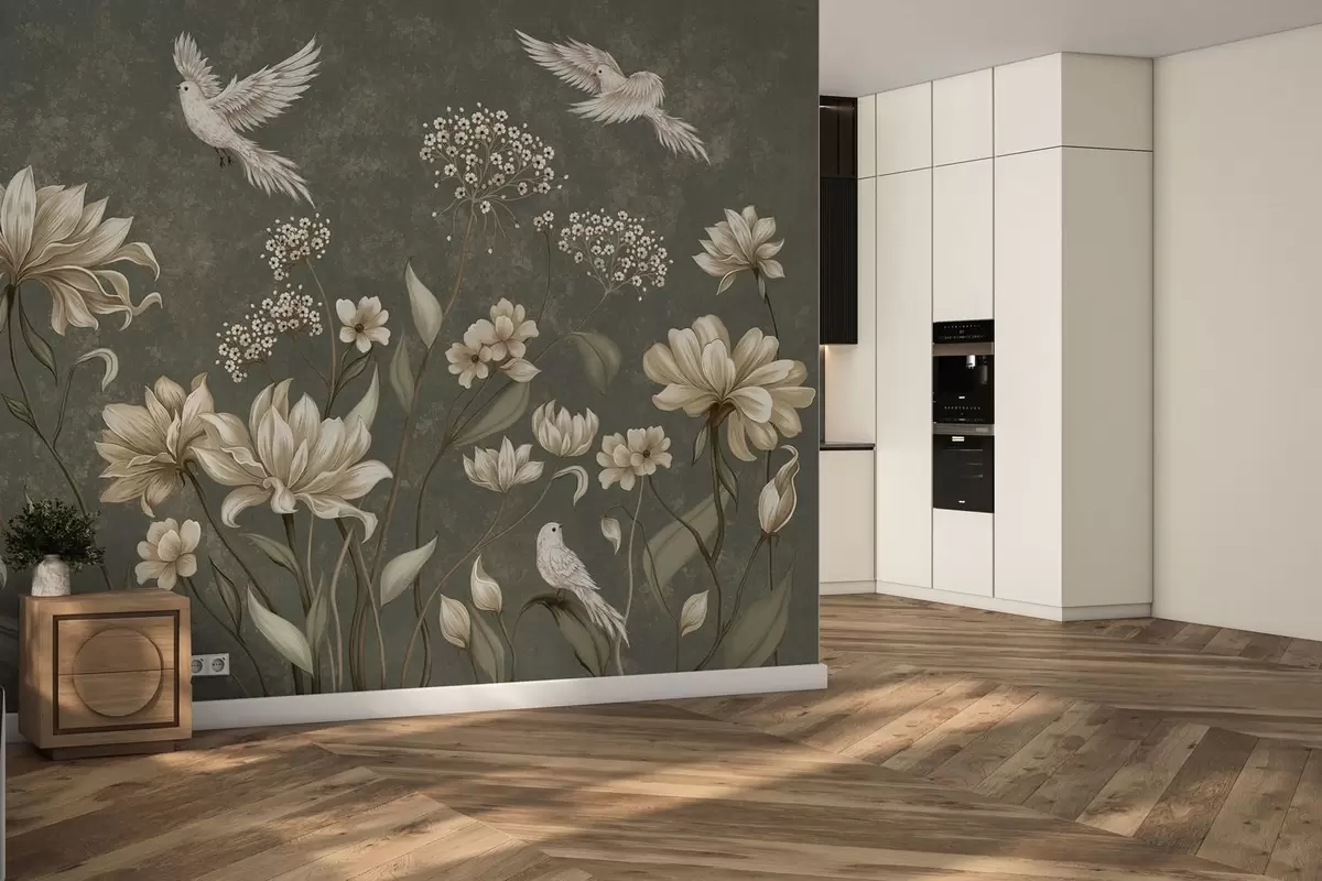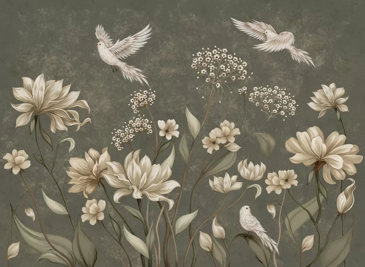 Valokuvatapetti Kukkia ja lintuja tummanvihreällä taustalla Nr w05118v3