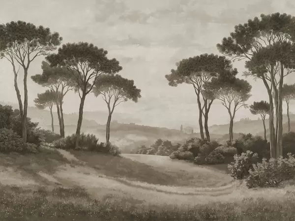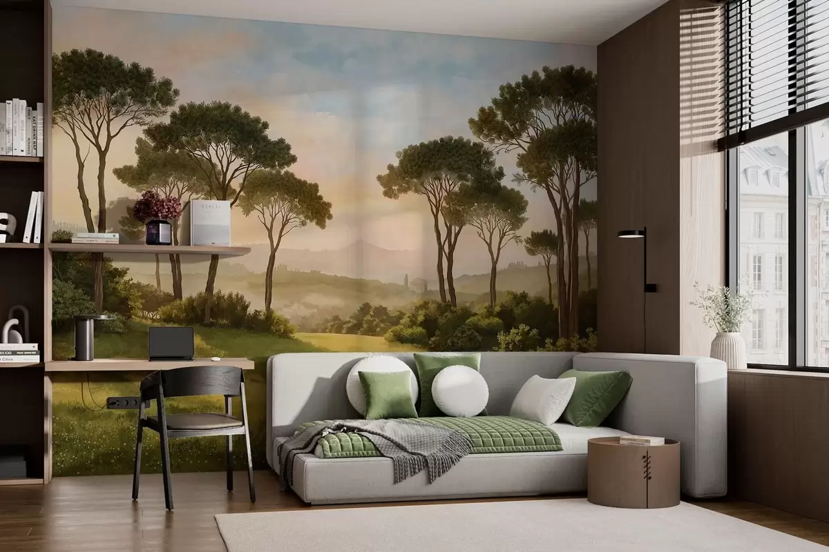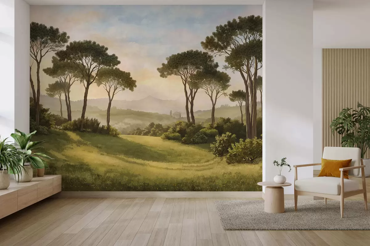 Valokuvatapetti Maisema, jossa puita lämpimässä auringonlaskun valossa Nr w05122