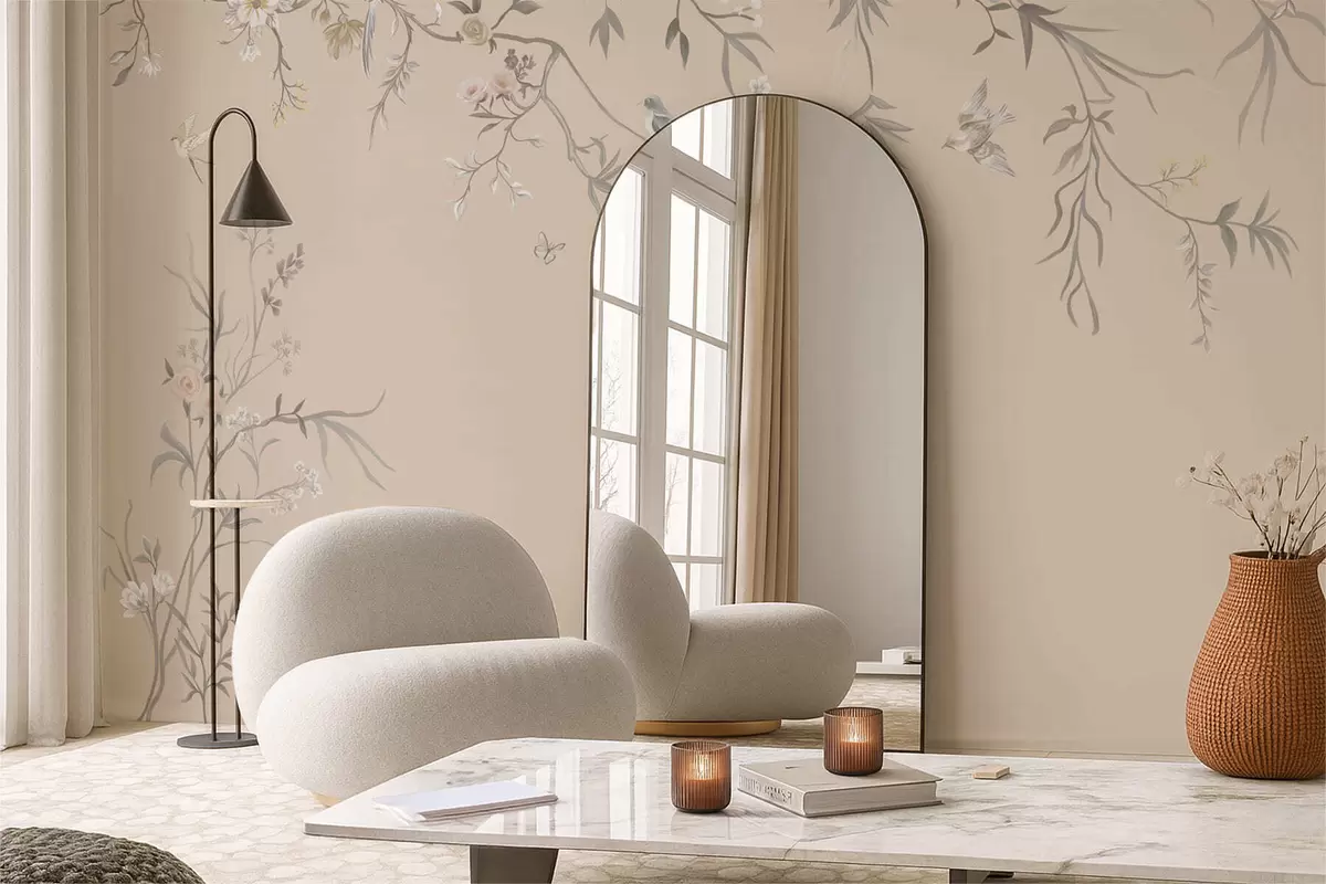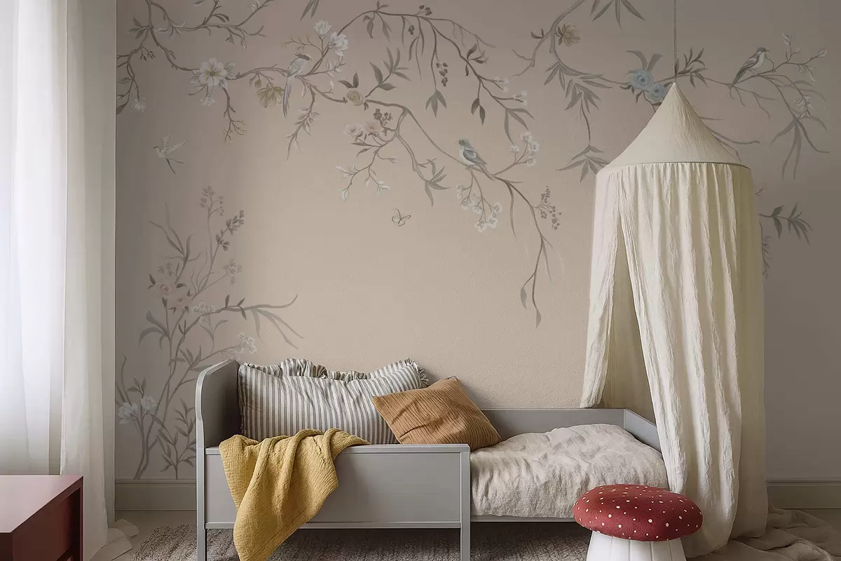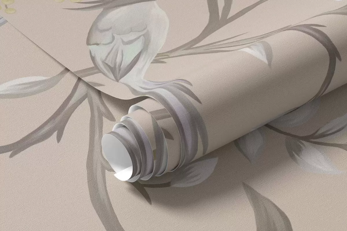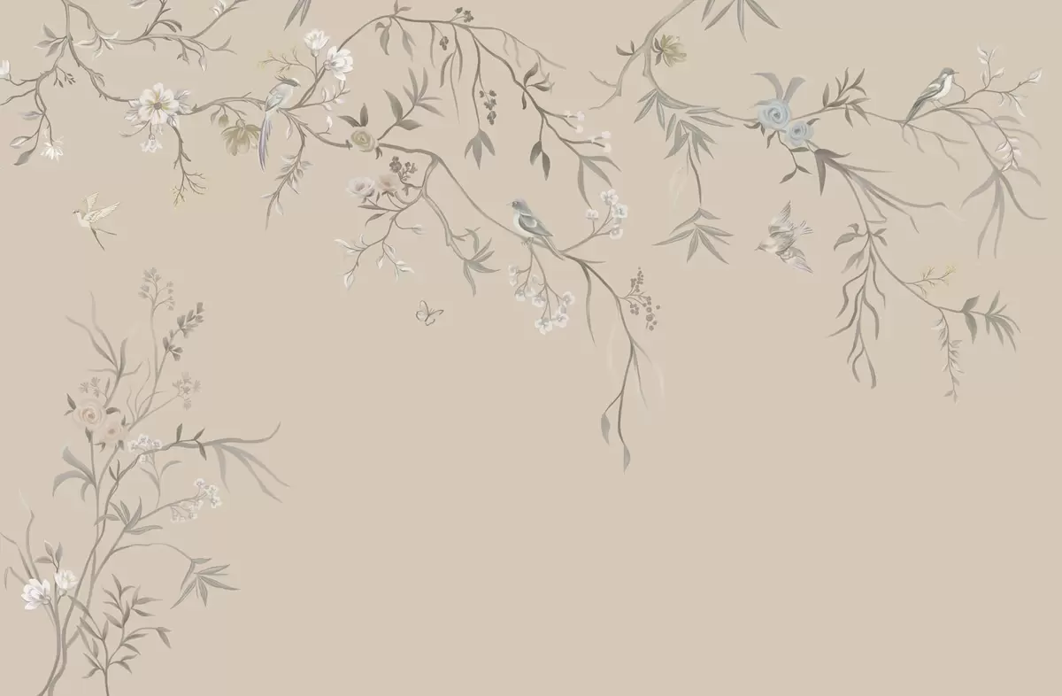 Valokuvatapetti Kukkaisoksat ja linnut lämpimällä beige-taustalla Nr w05127v1