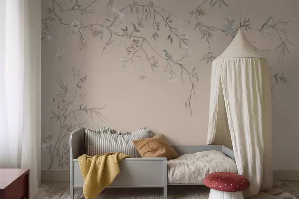 Valokuvatapetti Kukkaisoksat ja linnut lämpimällä beige-taustalla w05127v1