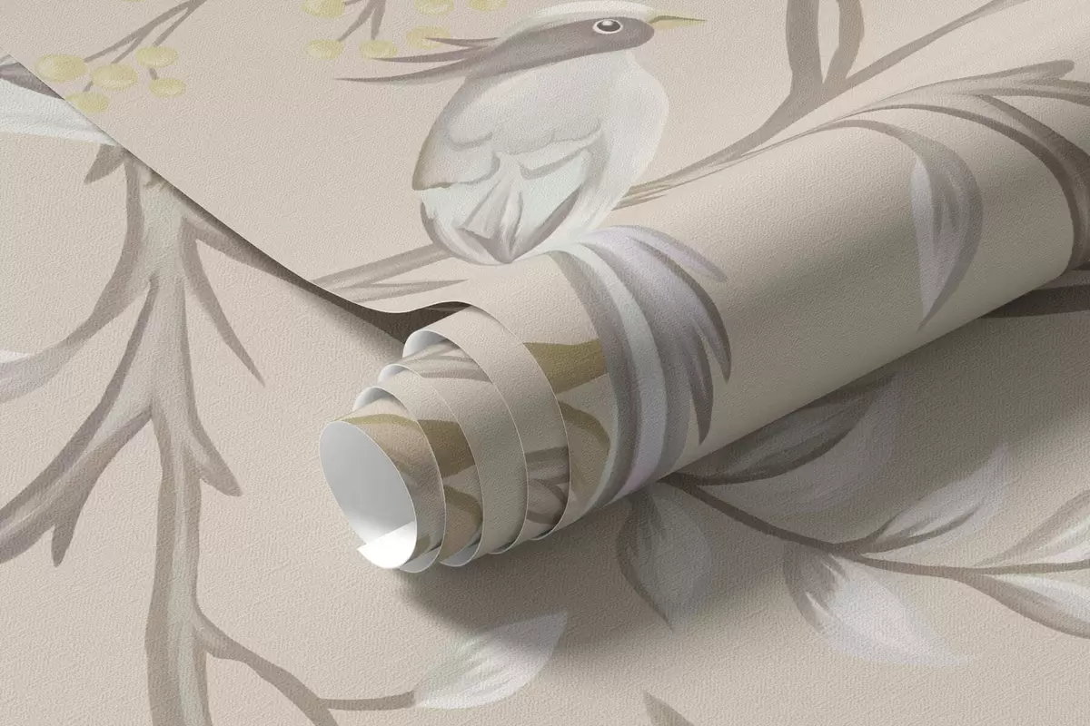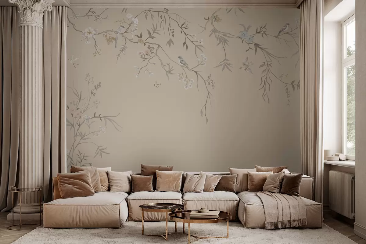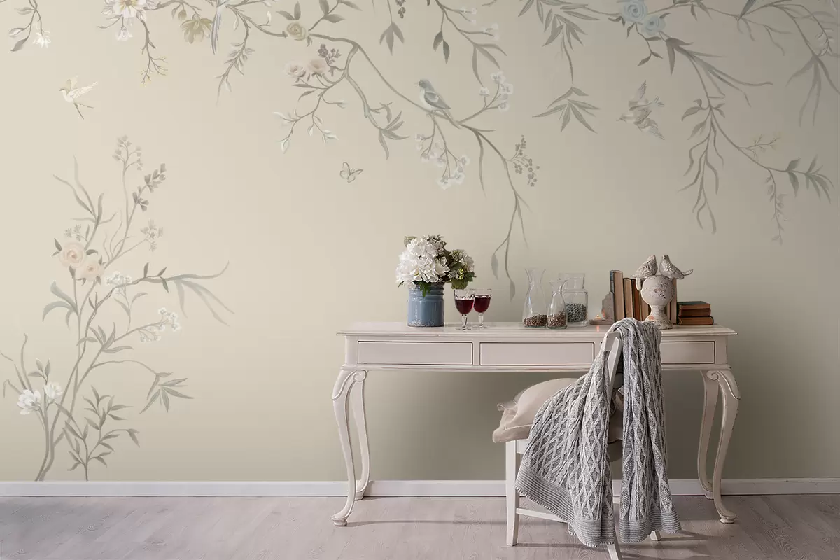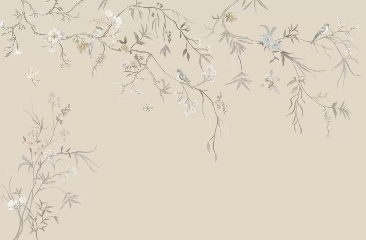 Valokuvatapetti Vaaleat kukat ja linnut pastellisävyisellä taustalla Nr w05127v2