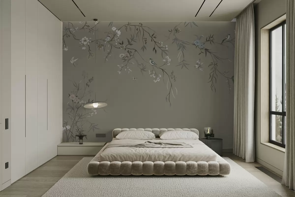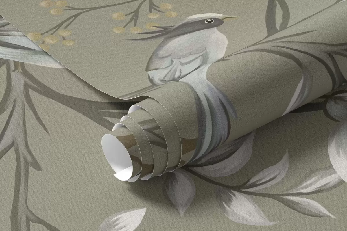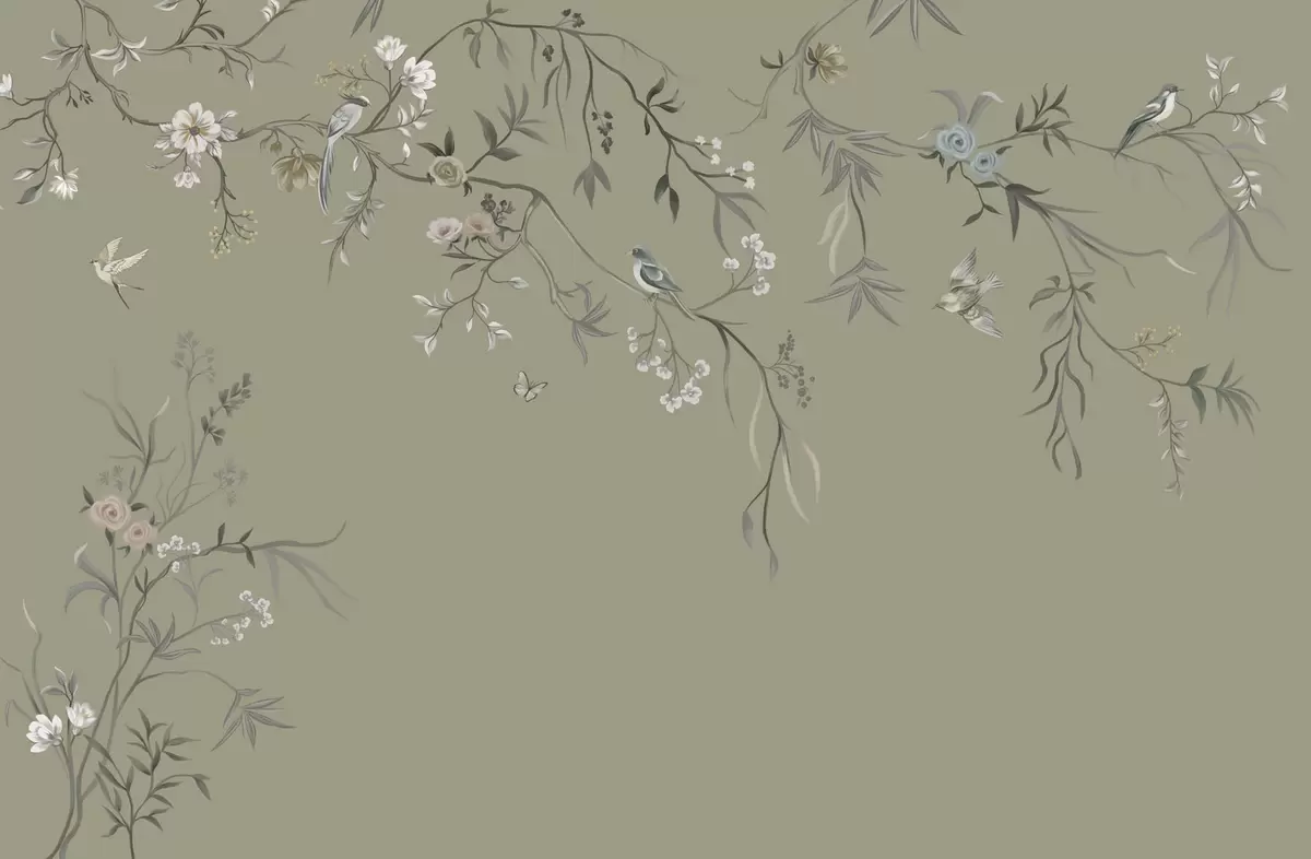 Valokuvatapetti Kukkakuvio ja linnut harmaalla taustalla Nr w05127v4