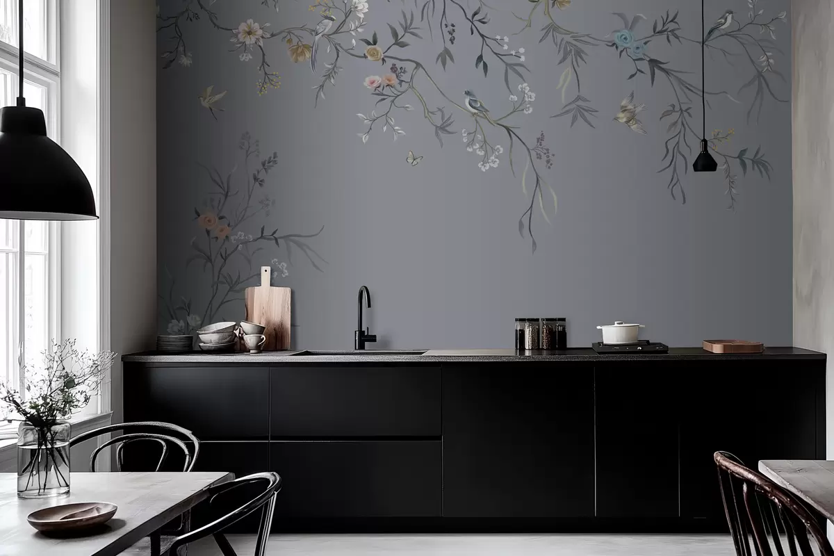 Valokuvatapetti Kukkaisoksat ja linnut vihertävällä taustalla Nr w05127v5