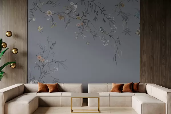 Valokuvatapetti Kukkaisoksat ja linnut vihertävällä taustalla Nr w05127v5