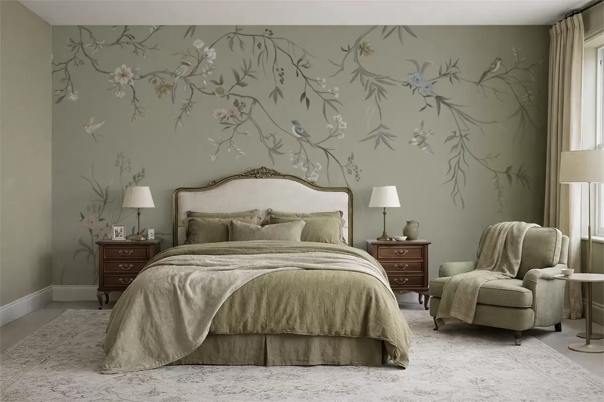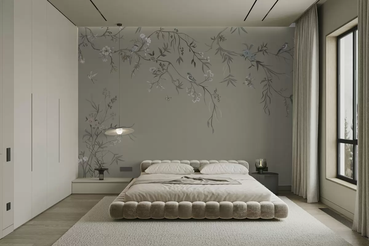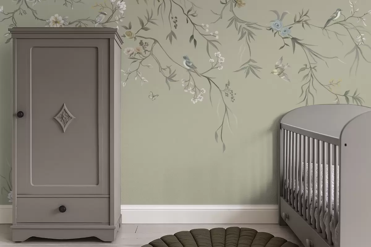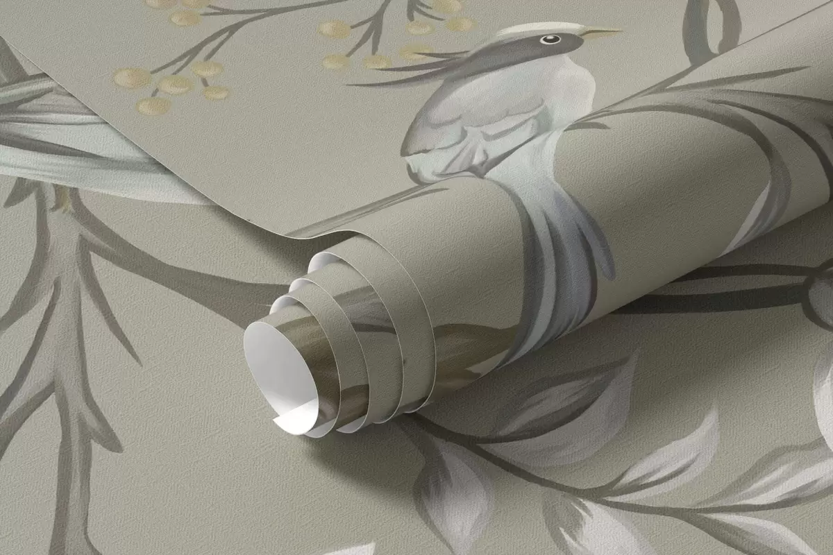 Valokuvatapetti Kukkakuvio ja linnut viileällä taustalla Nr w05127v6