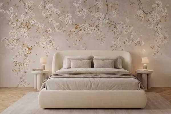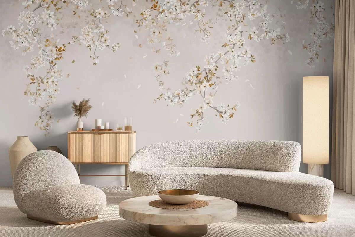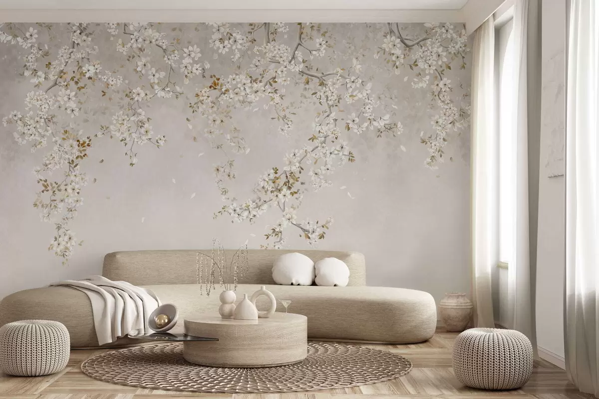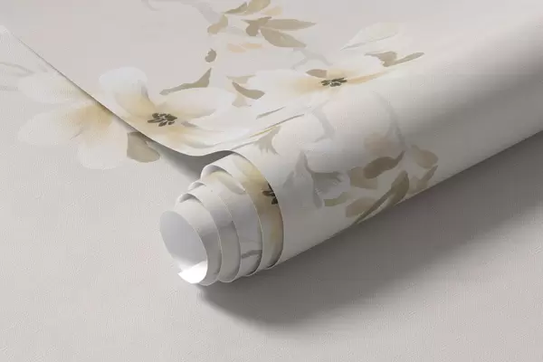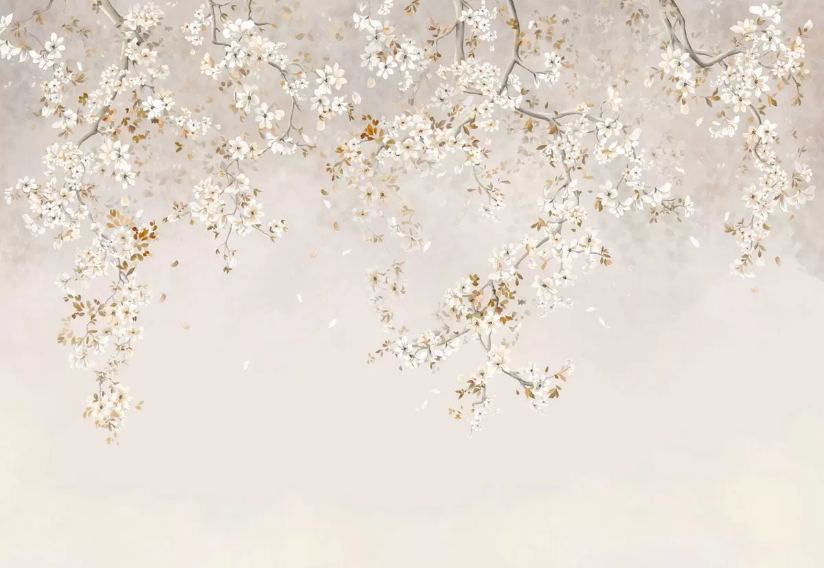 Valokuvatapetti Haarat, joissa on valkoisia kukkia pehmeällä beige-taustalla Nr w05129
