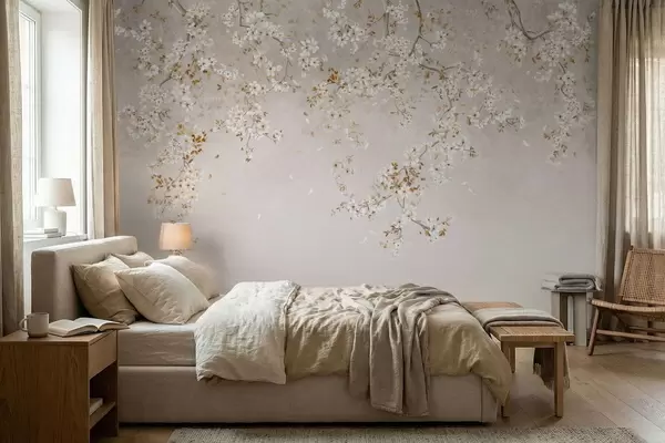 Valokuvatapetti Haarat, joissa on valkoisia kukkia pehmeällä beige-taustalla Nr w05129