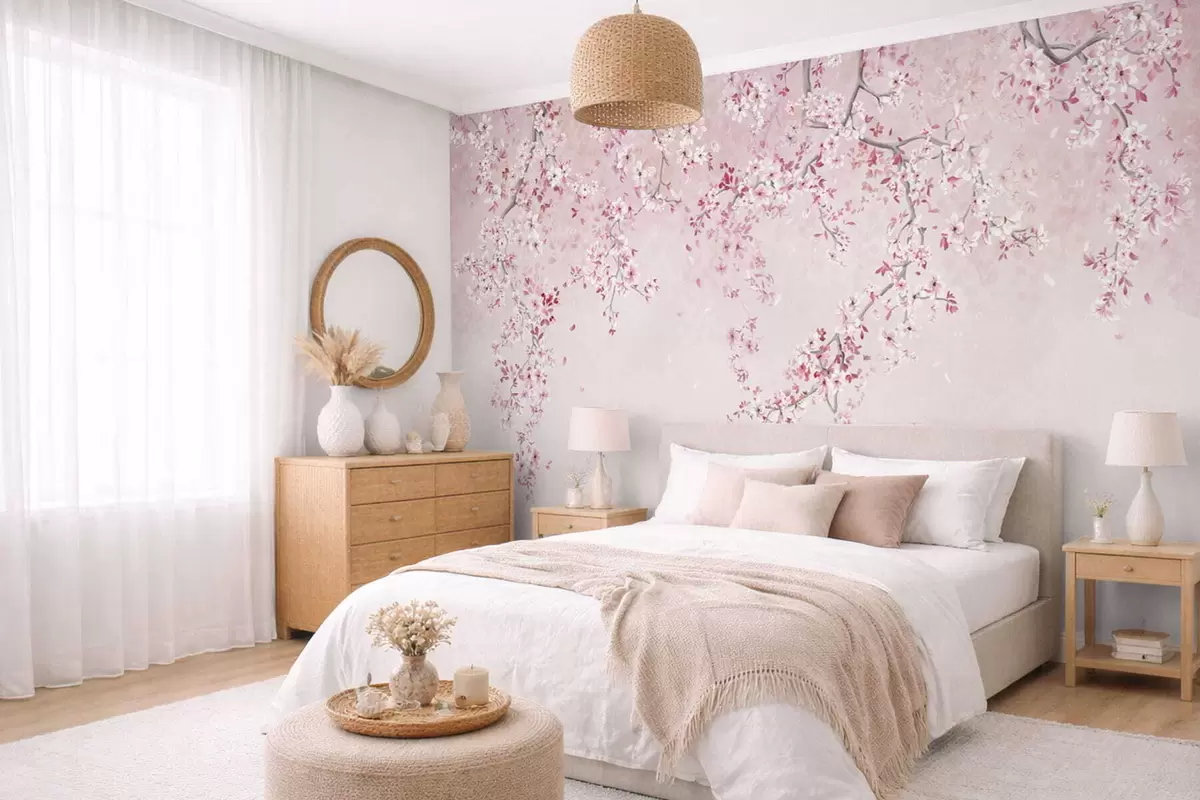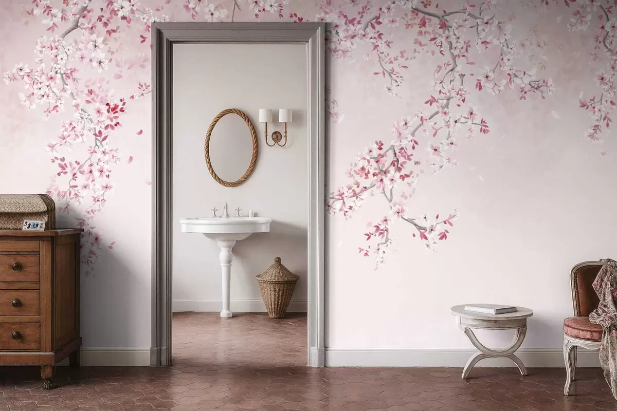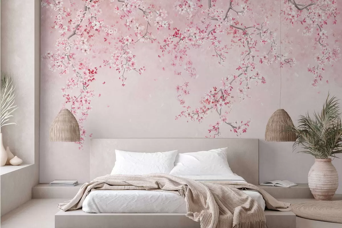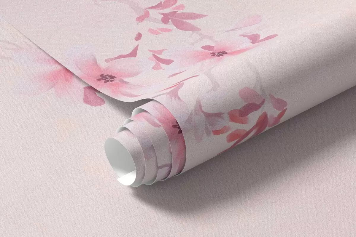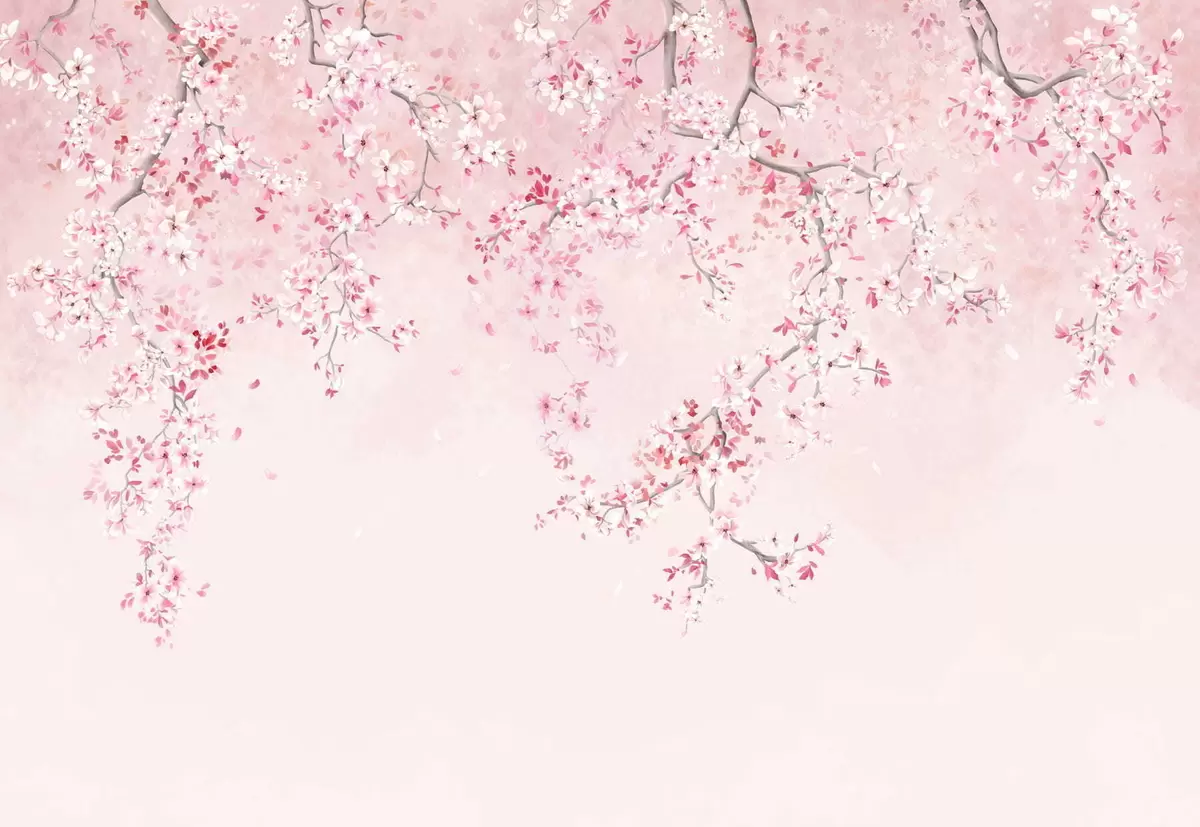 Valokuvatapetti Pehmeän pastellivärisen taustan edessä olevat oksat, joissa on vaaleanpunaisia kukkia Nr w05129v1