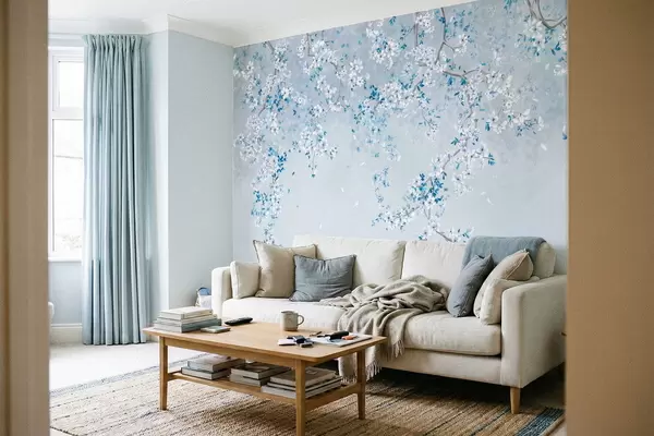 Valokuvatapetti Valkoiset ja siniset kukat viileällä taustalla Nr w05129v2