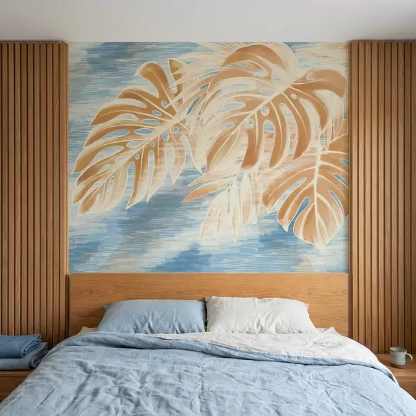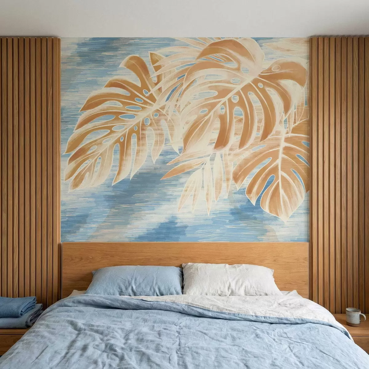 Valokuvatapetti Vaalean hiekkasävyiset lehdet sinisellä taustalla Nr w05130v1
