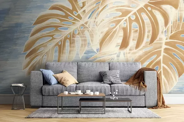 Valokuvatapetti Vaalean hiekkasävyiset lehdet sinisellä taustalla Nr w05130v1