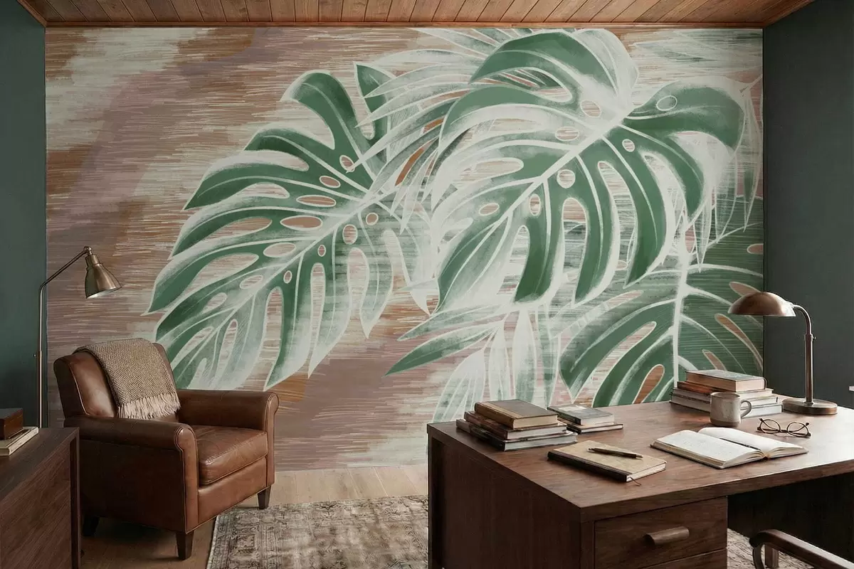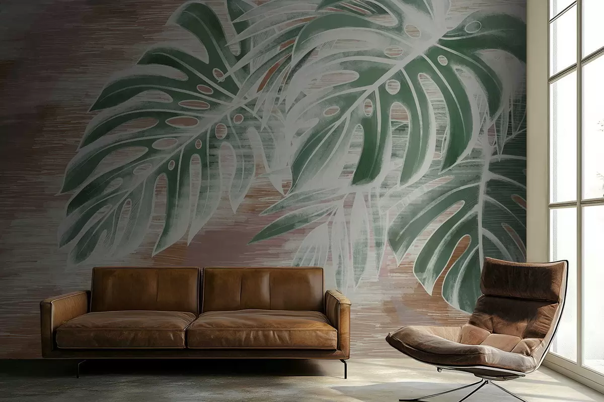 Valokuvatapetti Vihreät lehdet lämpimän tekstuurisella abstraktilla pohjalla Nr w05130v3