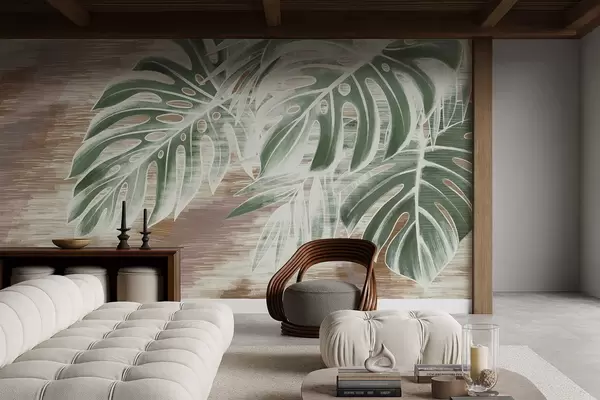 Valokuvatapetti Vihreät lehdet lämpimän tekstuurisella abstraktilla pohjalla Nr w05130v3