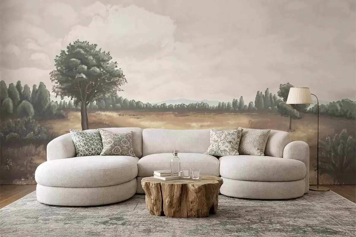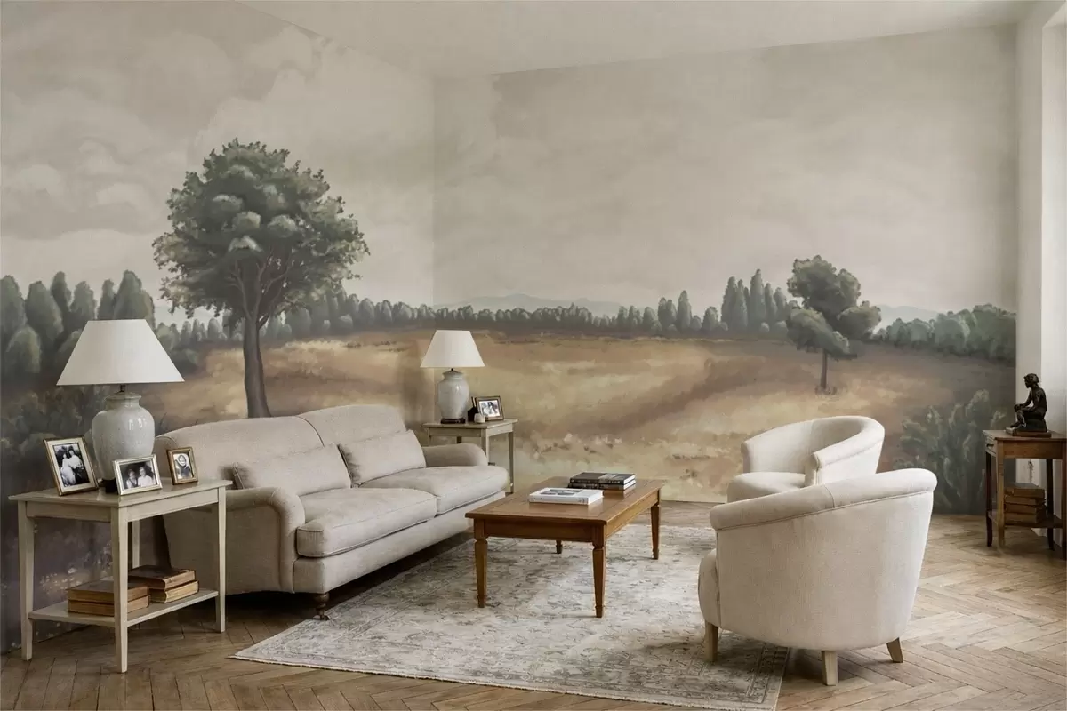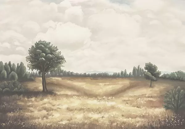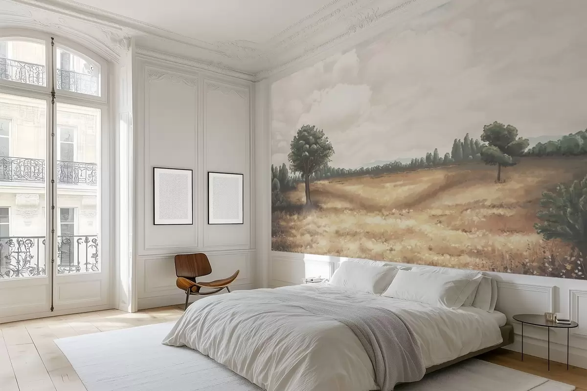 Valokuvatapetti Maalattu maisema puineen ja avoimella pellolla Nr w05131