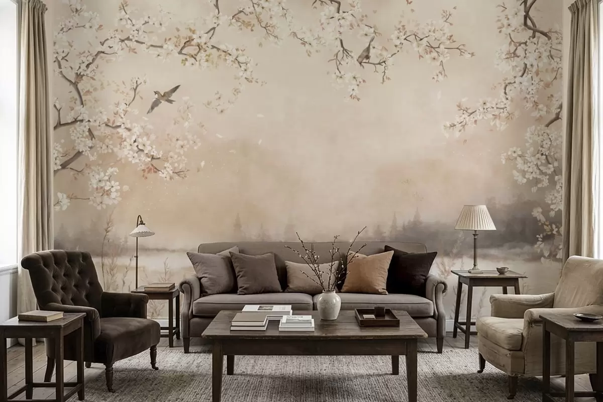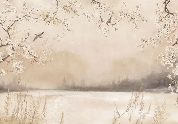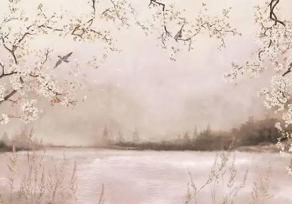 Valokuvatapetti Hienot kukkivat oksat järven rannalla, jossa linnut lentelevät kevyessä sumussa Nr w05155