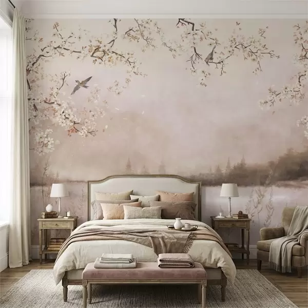 Valokuvatapetti Kukkivat oksat rauhallisen järven yllä, linnut sumussa Nr w05155v1