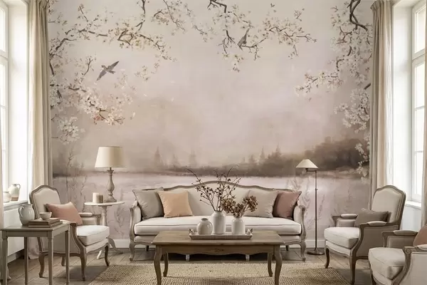 Valokuvatapetti Kukkivat oksat rauhallisen järven yllä, linnut sumussa Nr w05155v1