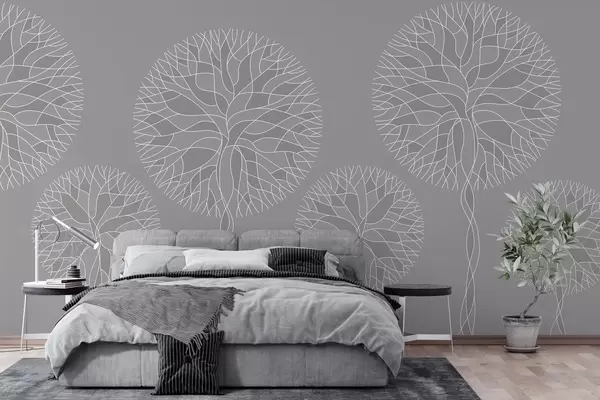 Valokuvatapetti Fantasiamaiset lineaariset puut, joiden latvukset ovat rehevät ja sävyltään keskivaalean harmaat Nr w05213v5