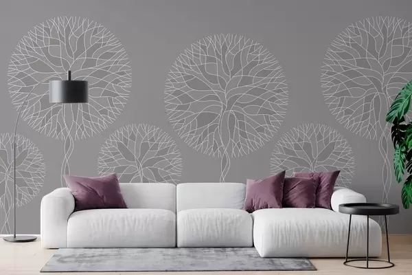 Valokuvatapetti Fantasiamaiset lineaariset puut, joiden latvukset ovat rehevät ja sävyltään keskivaalean harmaat Nr w05213v5