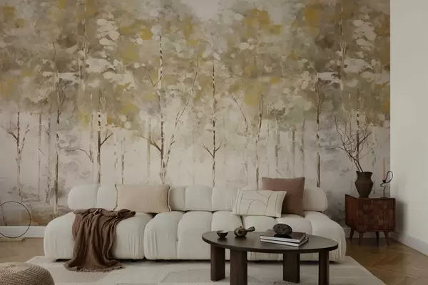 Valokuvatapetti Tyylitelty metsä, jossa on hoikkia puita lämpimissä sävyissä Nr w05221