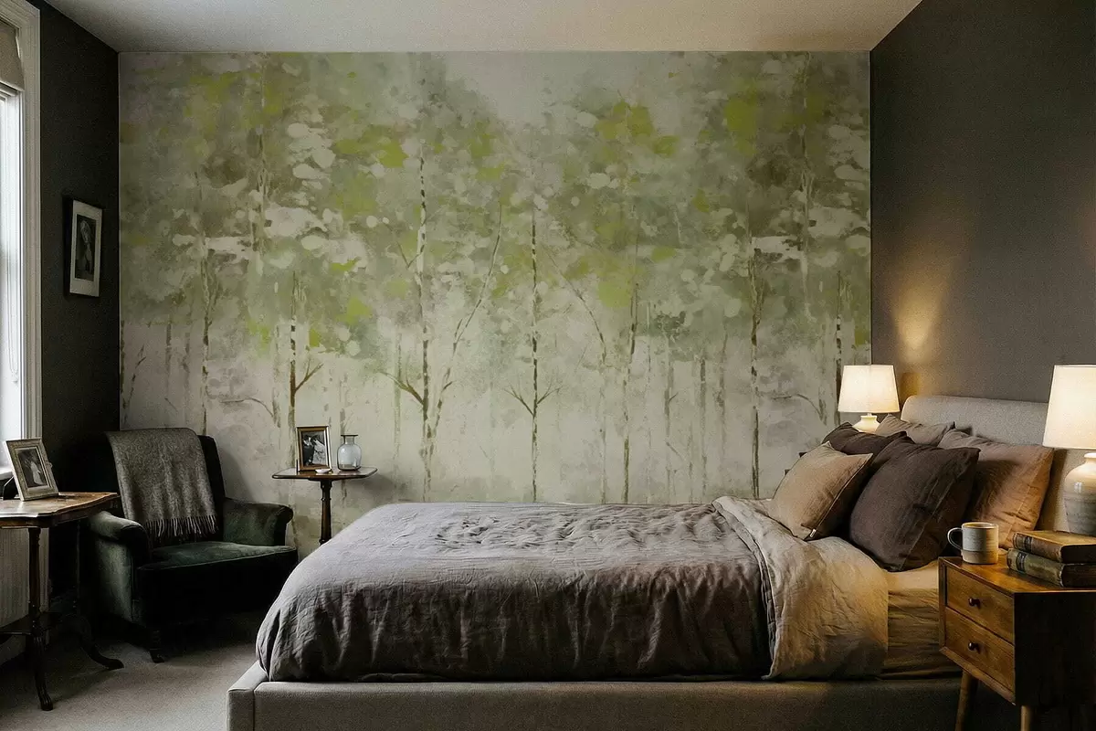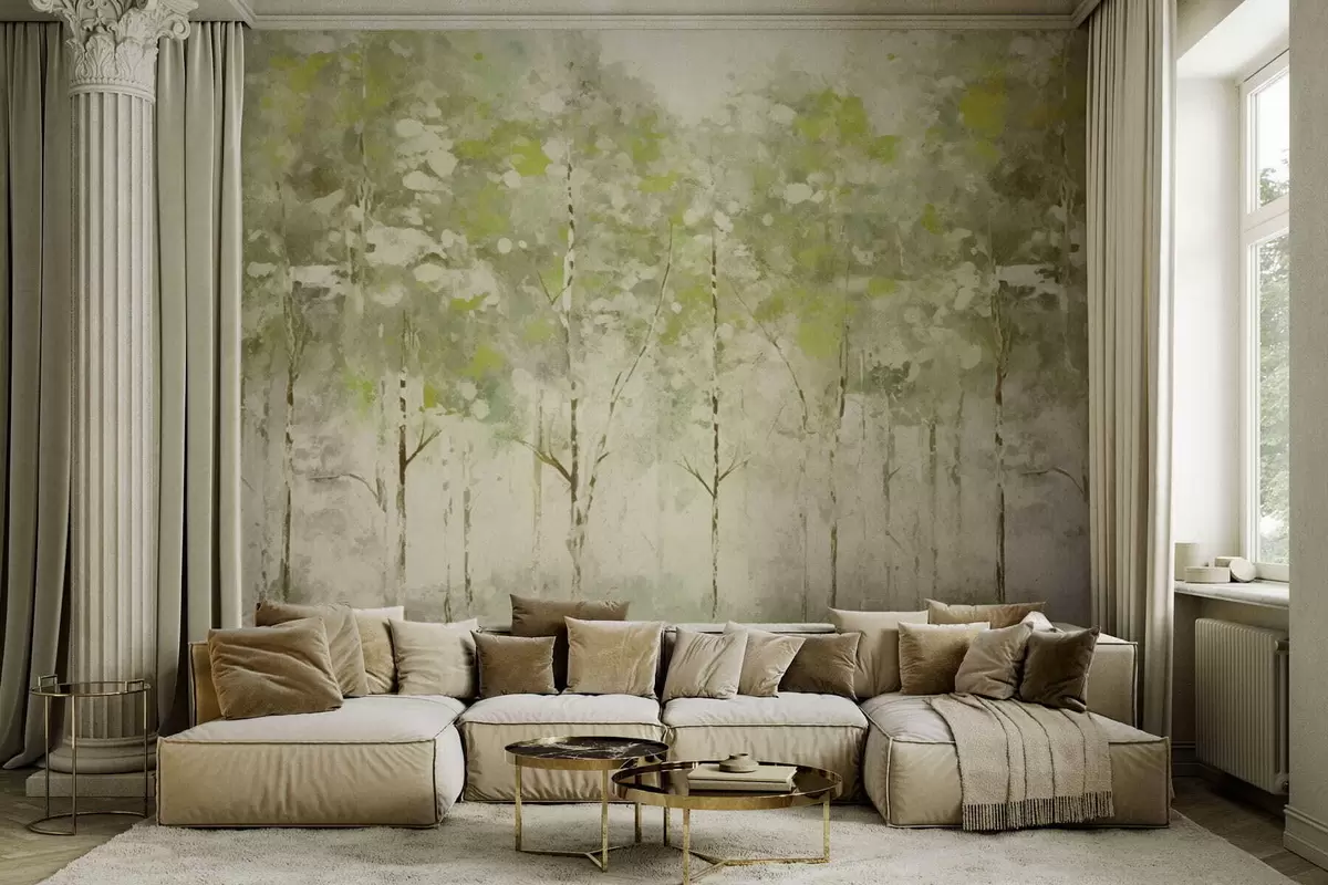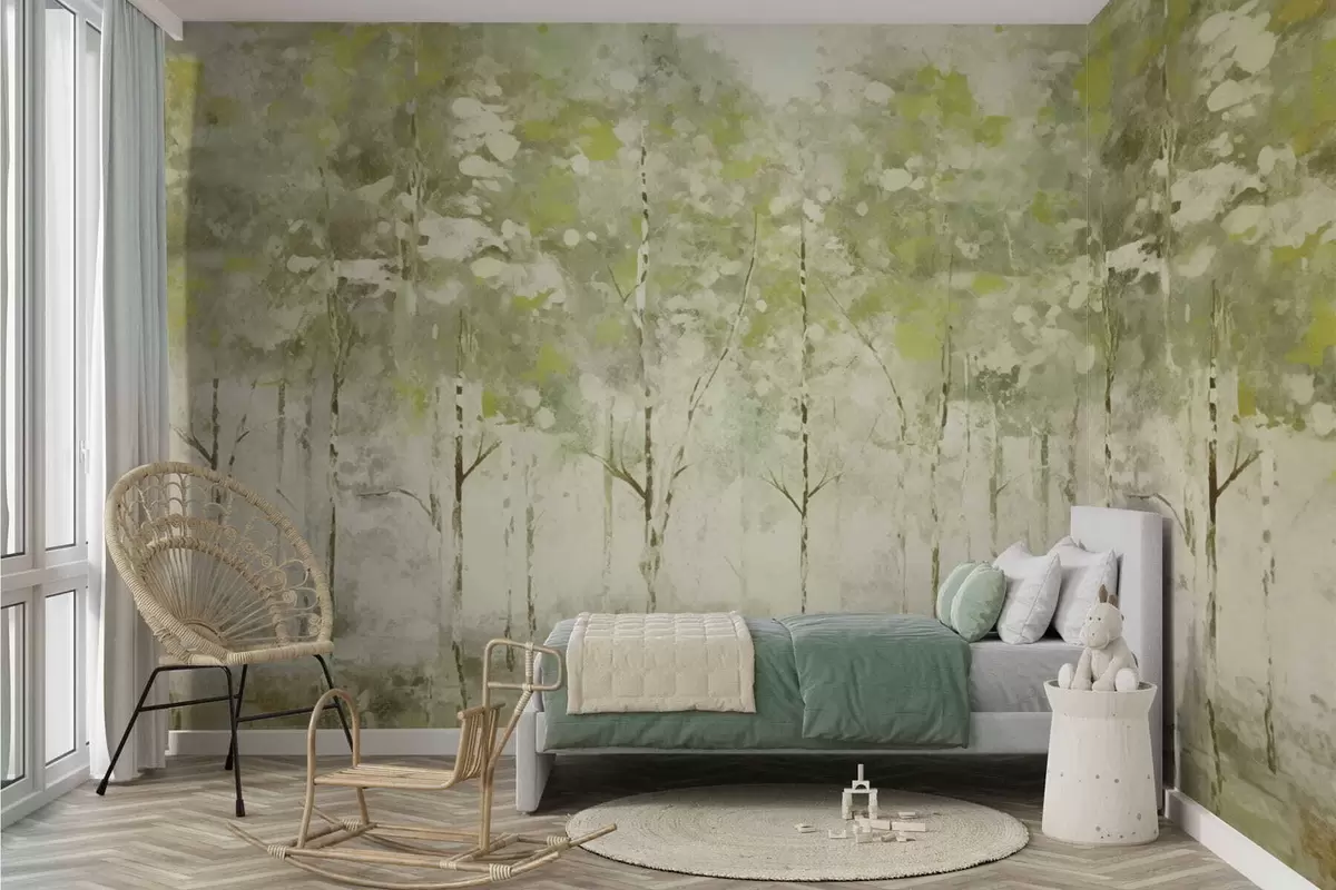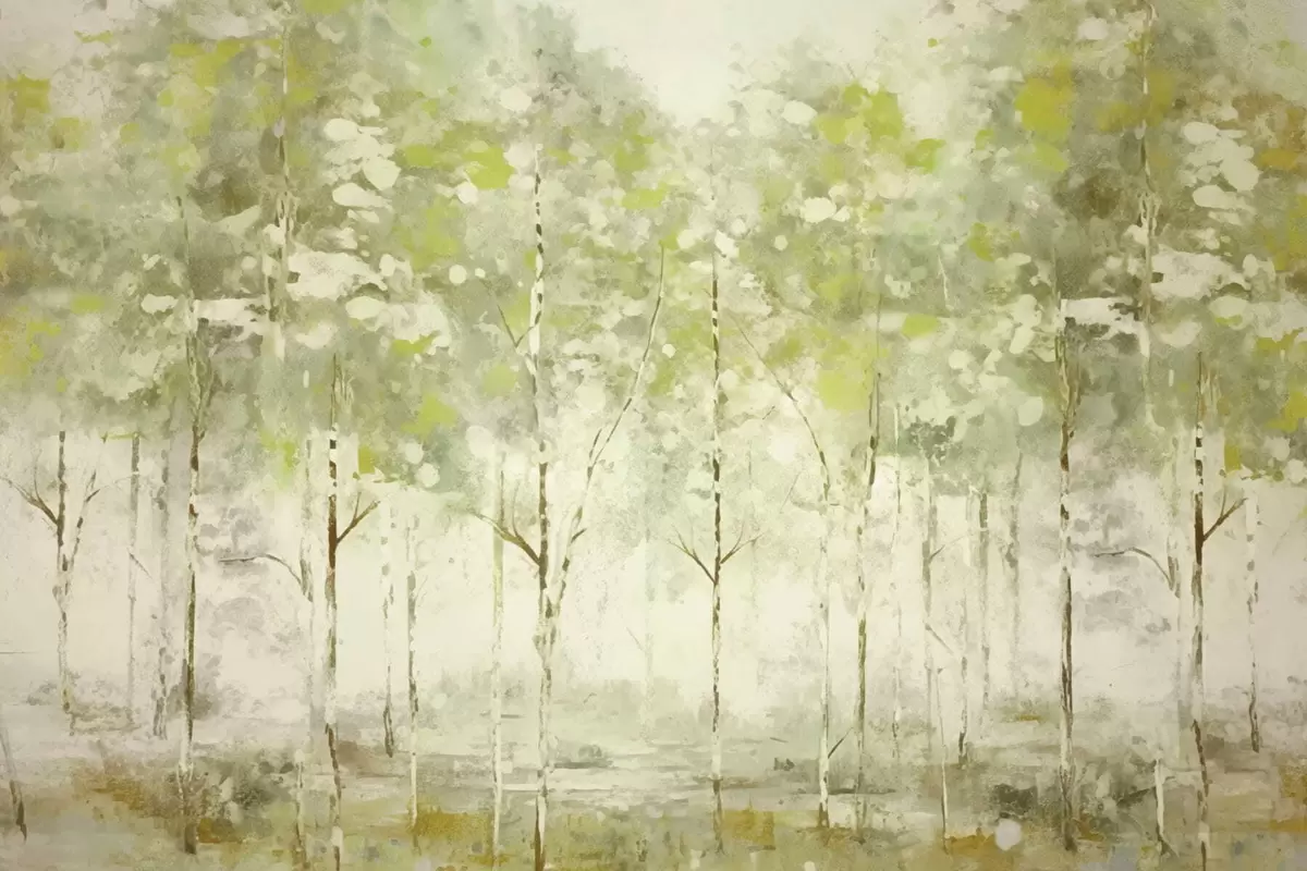 Valokuvatapetti Tyylitelty metsä, jossa on hoikkia puita vihreissä sävyissä Nr w05221v1