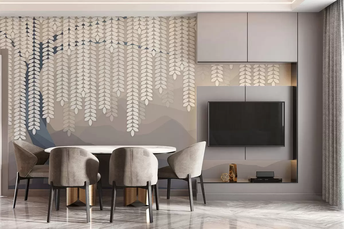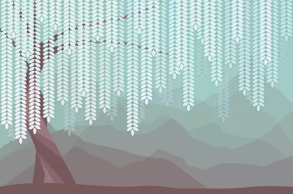 Valokuvatapetti tyylitelty paju, jonka lehdet roikkuvat minimalististen, beige- ja sinivihreän sävyisten vuorten taustalla Nr w05232