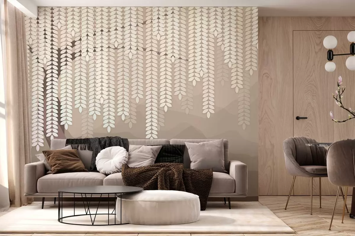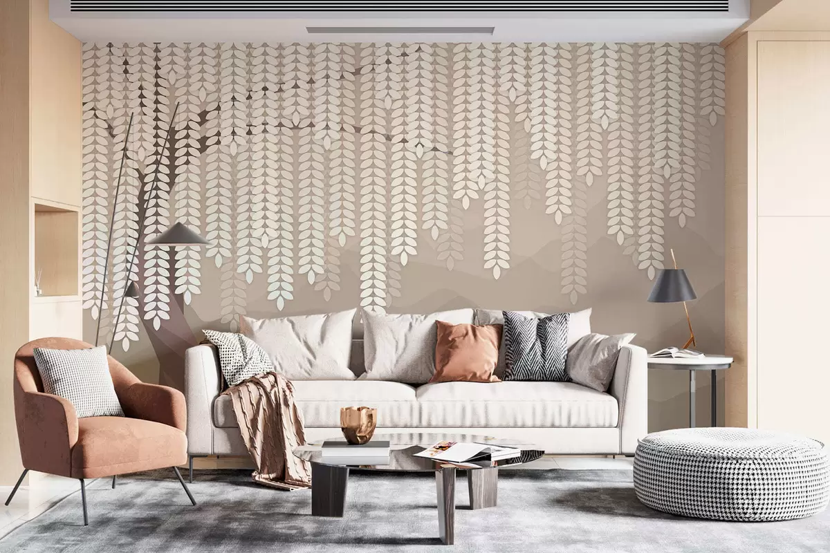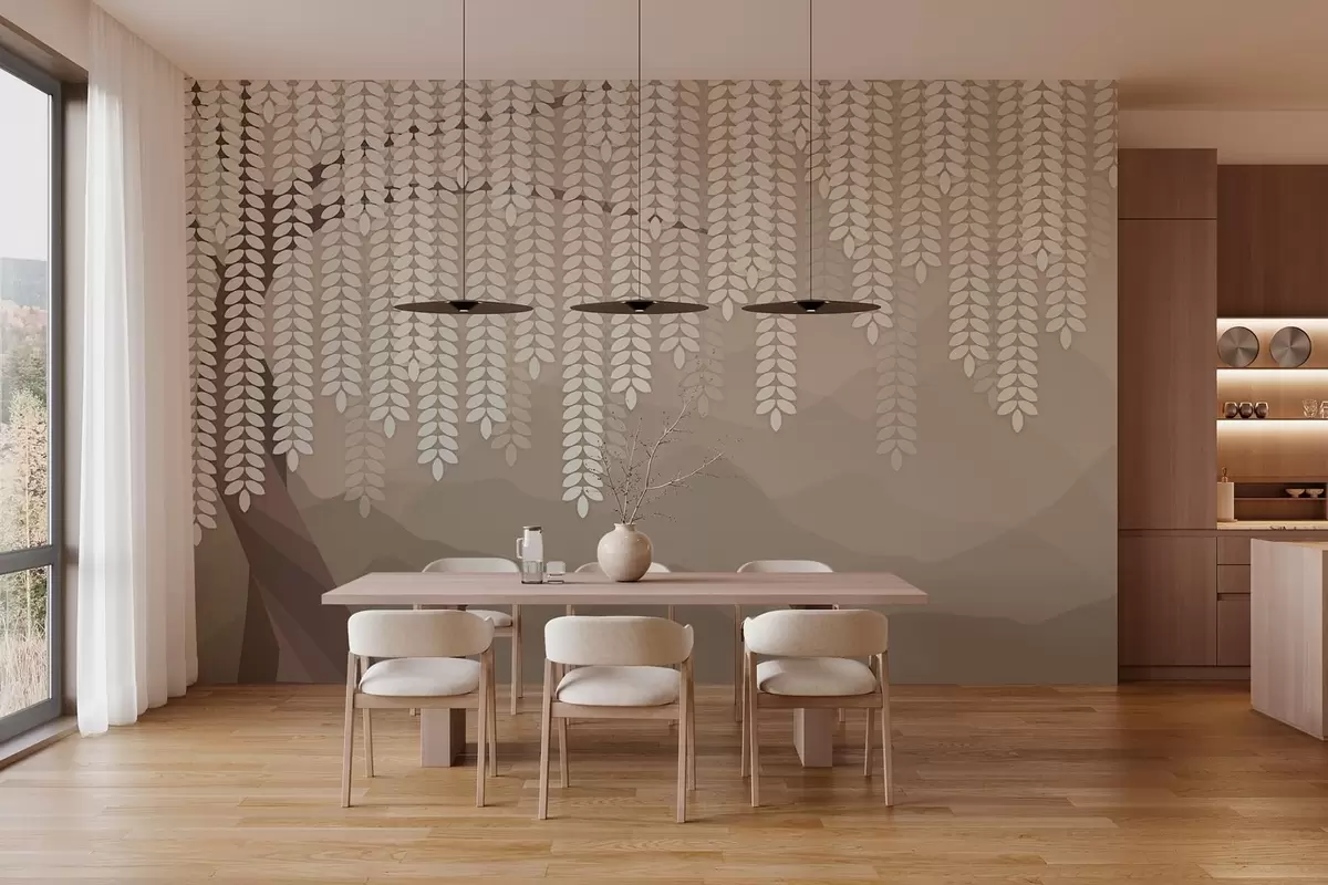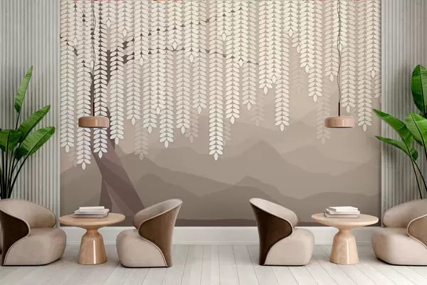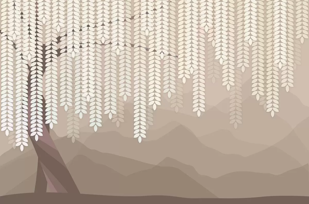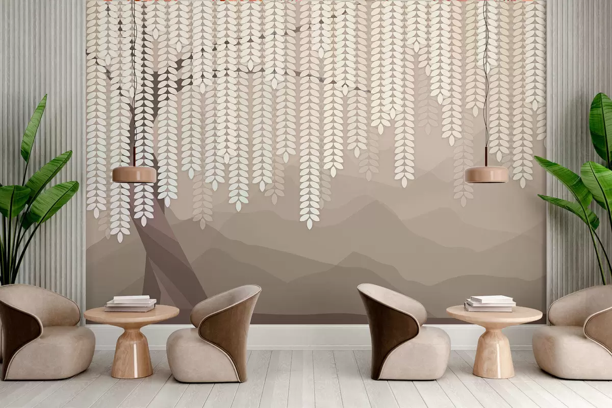 Valokuvatapetti tyylitelty paju, jonka lehdet roikkuvat minimalististen, kahvinväristen vuorten taustalla Nr w05232v2