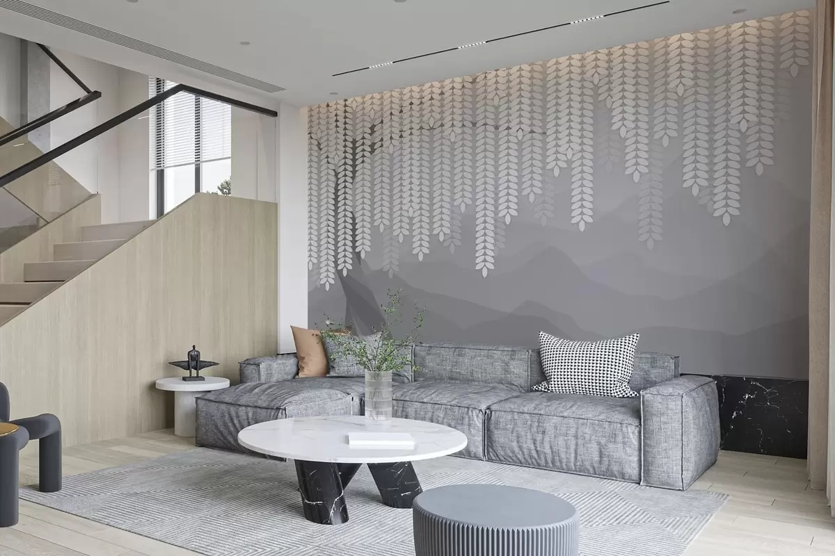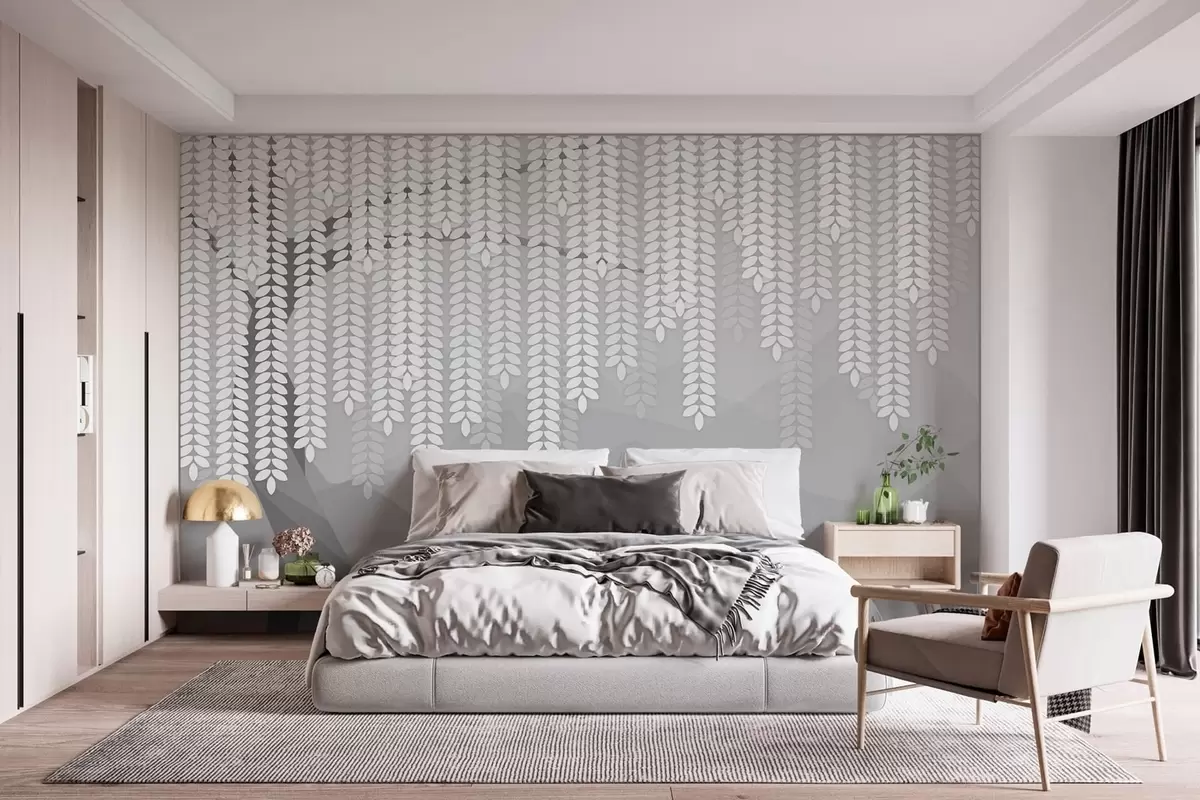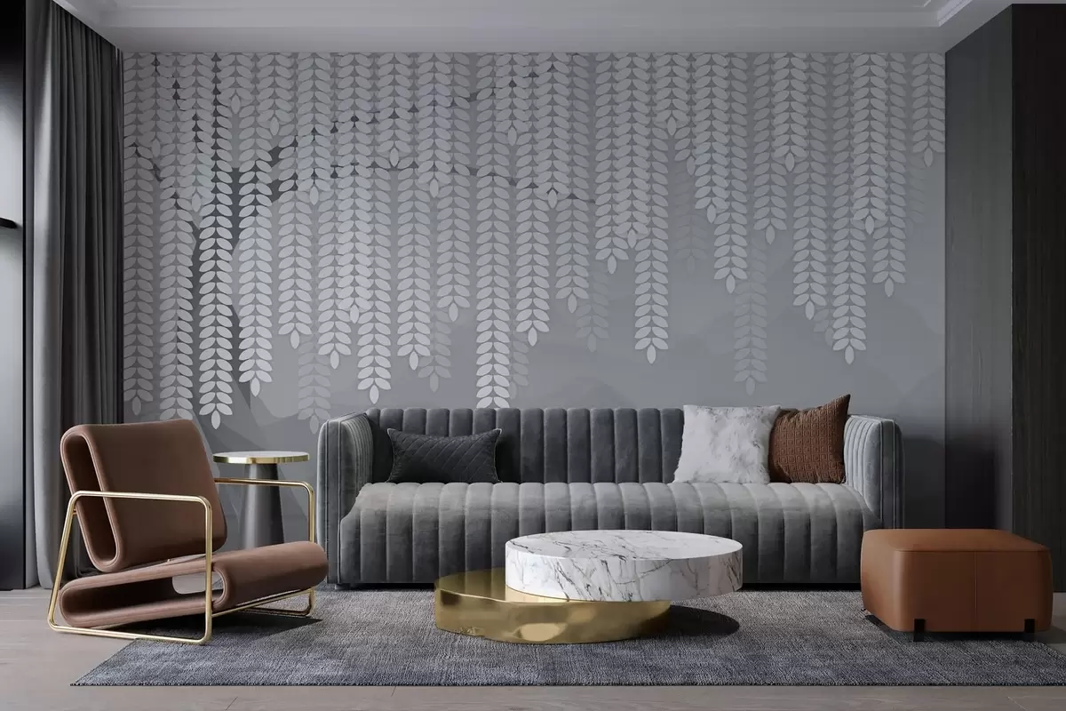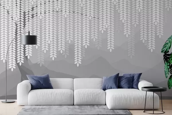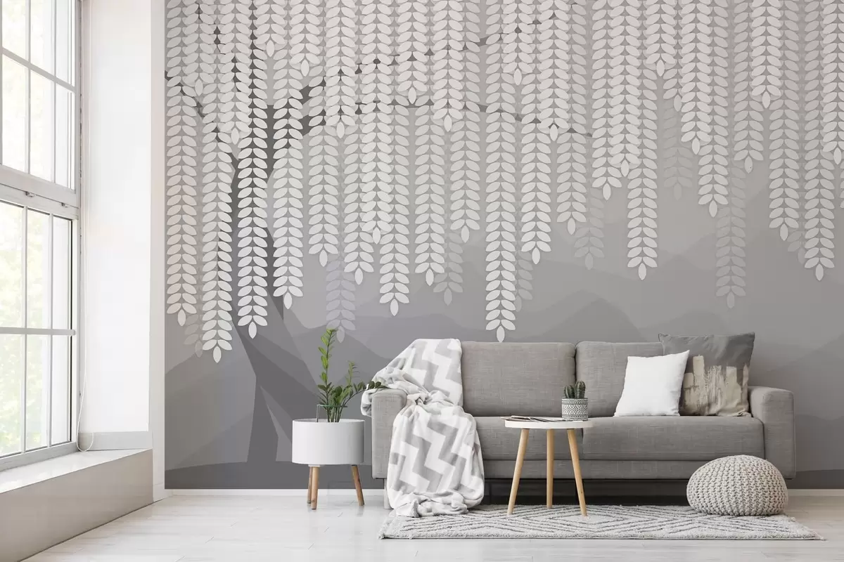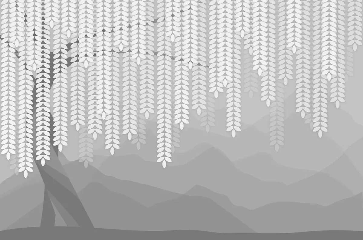 Valokuvatapetti tyylitelty paju, jonka lehdet roikkuvat minimalististen, harmaasävyisten vuorten taustalla Nr w05232v3