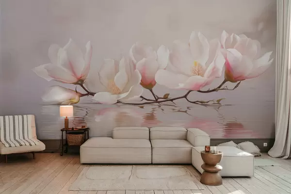 Valokuvatapetti Magnolian oksa kukineen rauhallisen veden heijastuksen yläpuolella Nr w05353v1