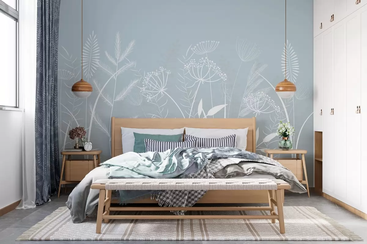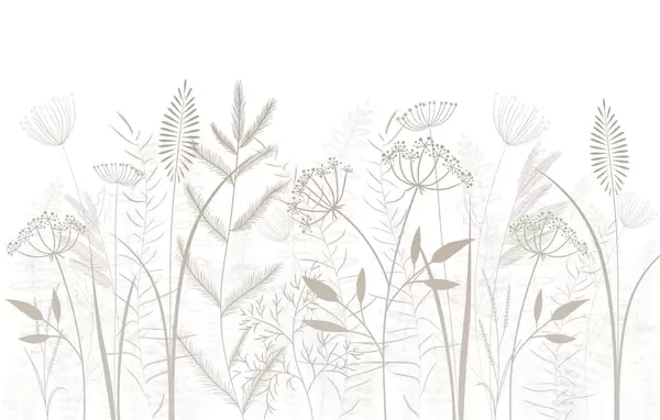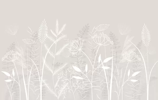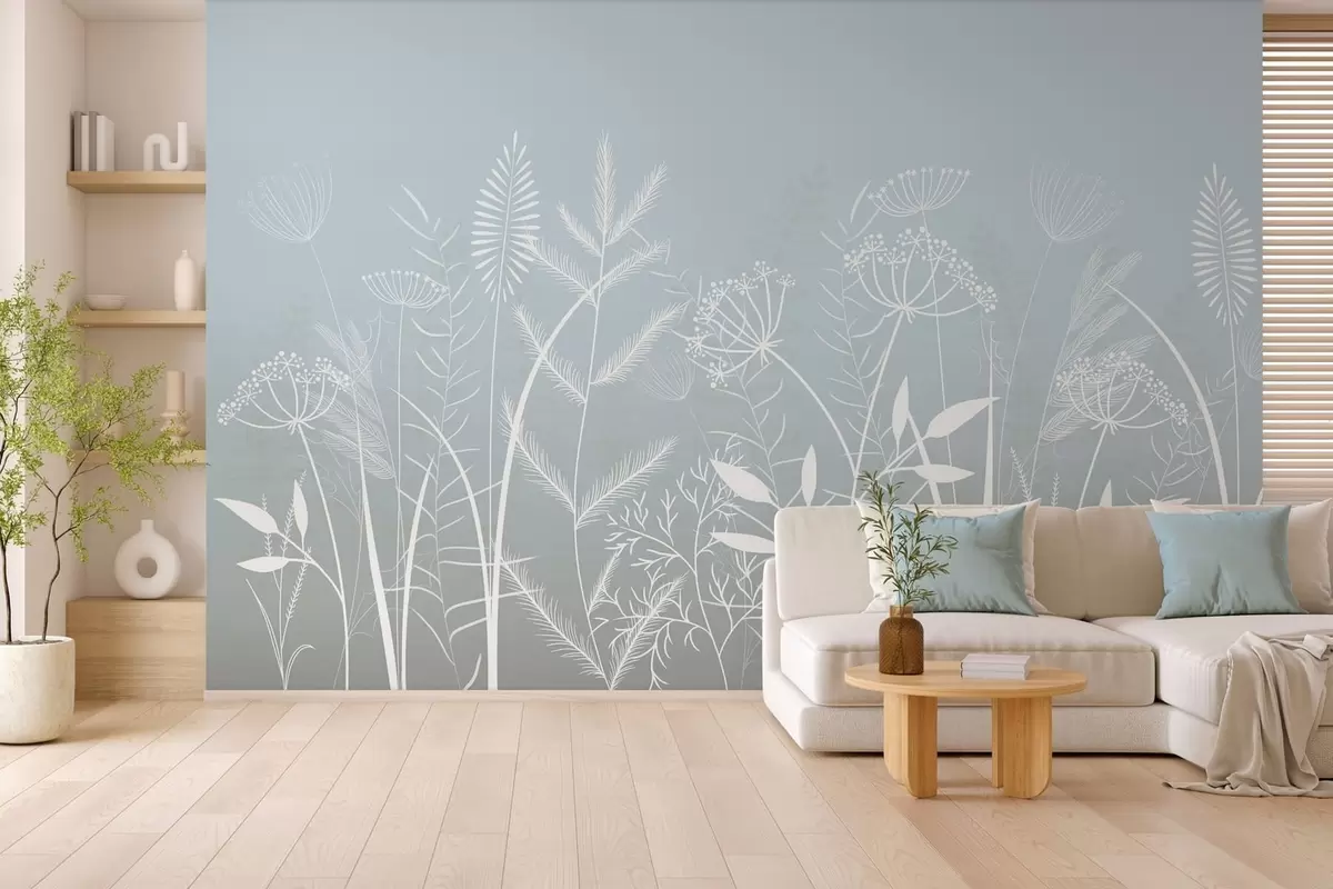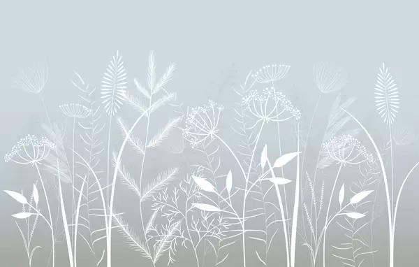 Valokuvatapetti hienovaraiset, käsinmaalatut luonnonkasvit ja kukat harmaansinisellä taustalla Nr w05383