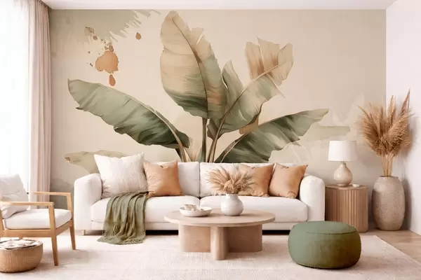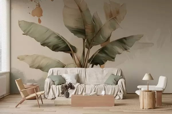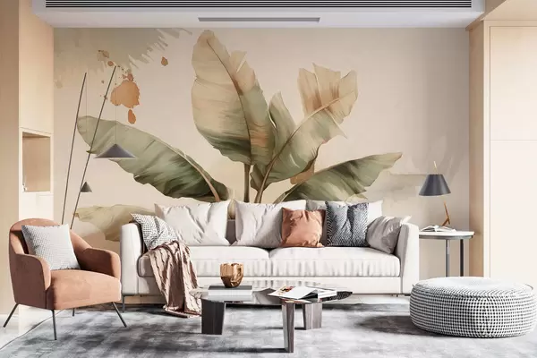 Valokuvatapetti suuri, viehättävä banaanilehtien rypäs, jossa on retrohenkisiä väriroiskeita Nr w05384