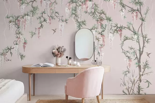 Valokuvatapetti Kukkivat oksat, joissa on vaaleanpunaisia kukkia ja lintuja Nr w05394v1