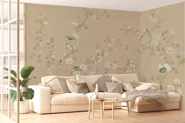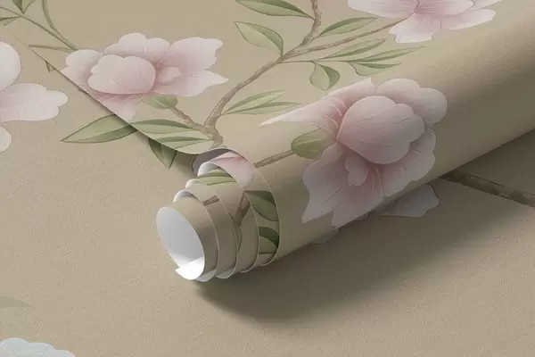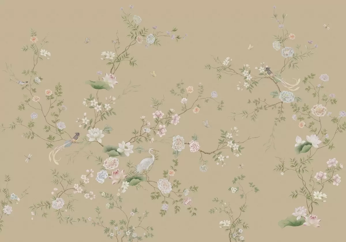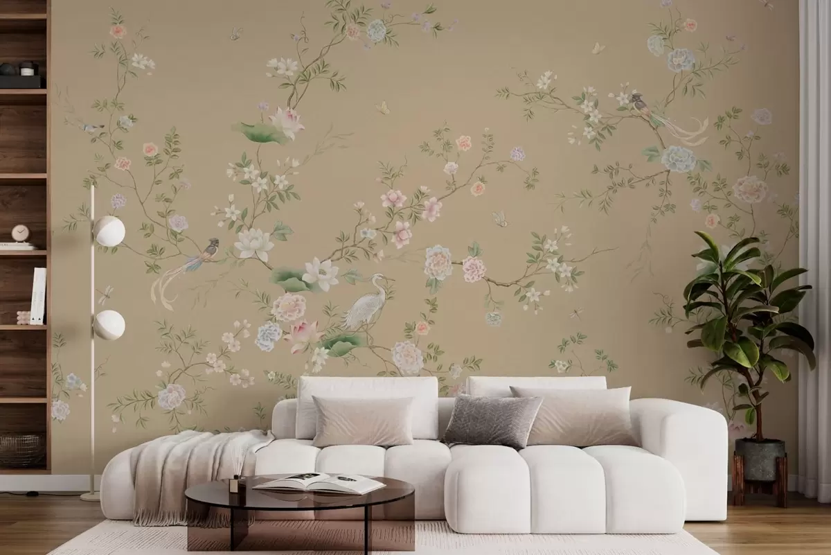 Valokuvatapetti Kukkivat oksat ja linnut lämpimän beigeä taustaa vasten Nr w05416v2