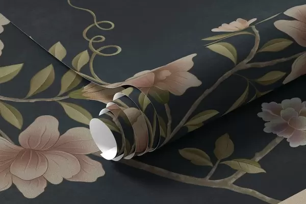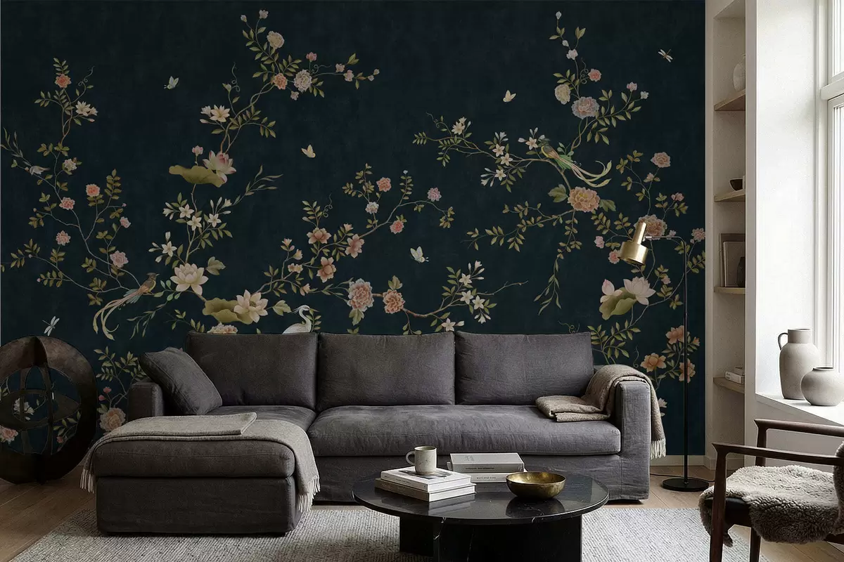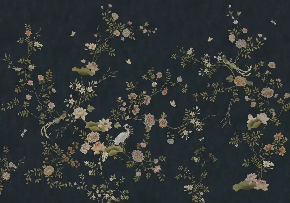 Valokuvatapetti Kukkivat oksat ja linnut tummalla taustalla Nr w05416v3