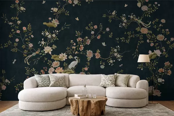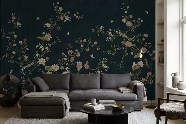 Valokuvatapetti Kukkivat oksat ja linnut tummalla taustalla w05416v3