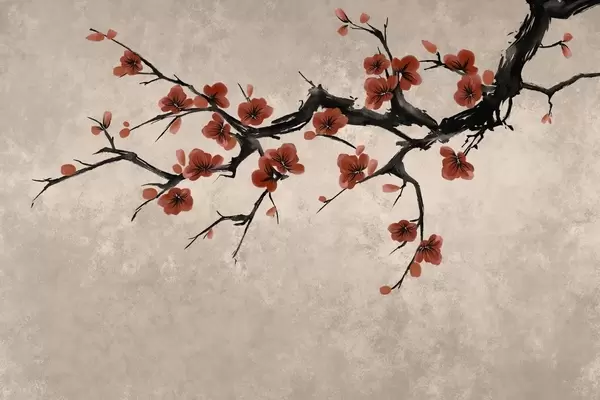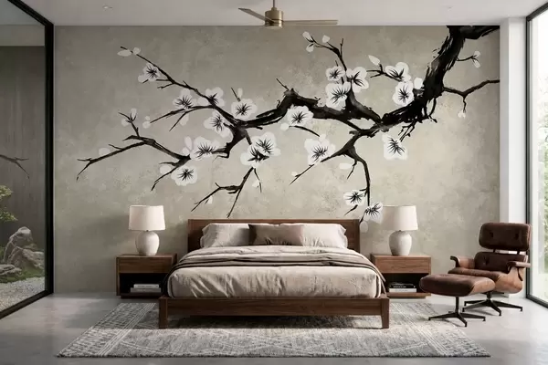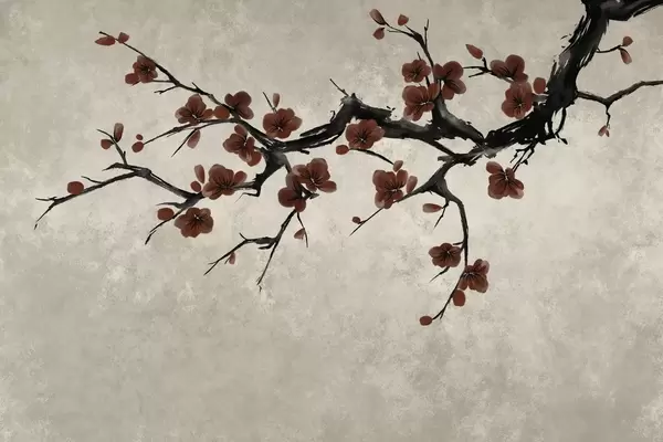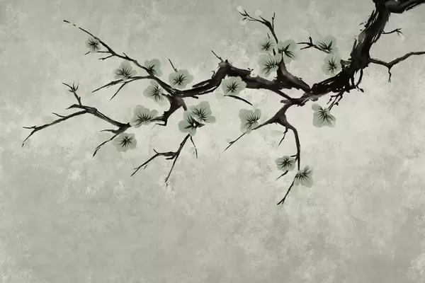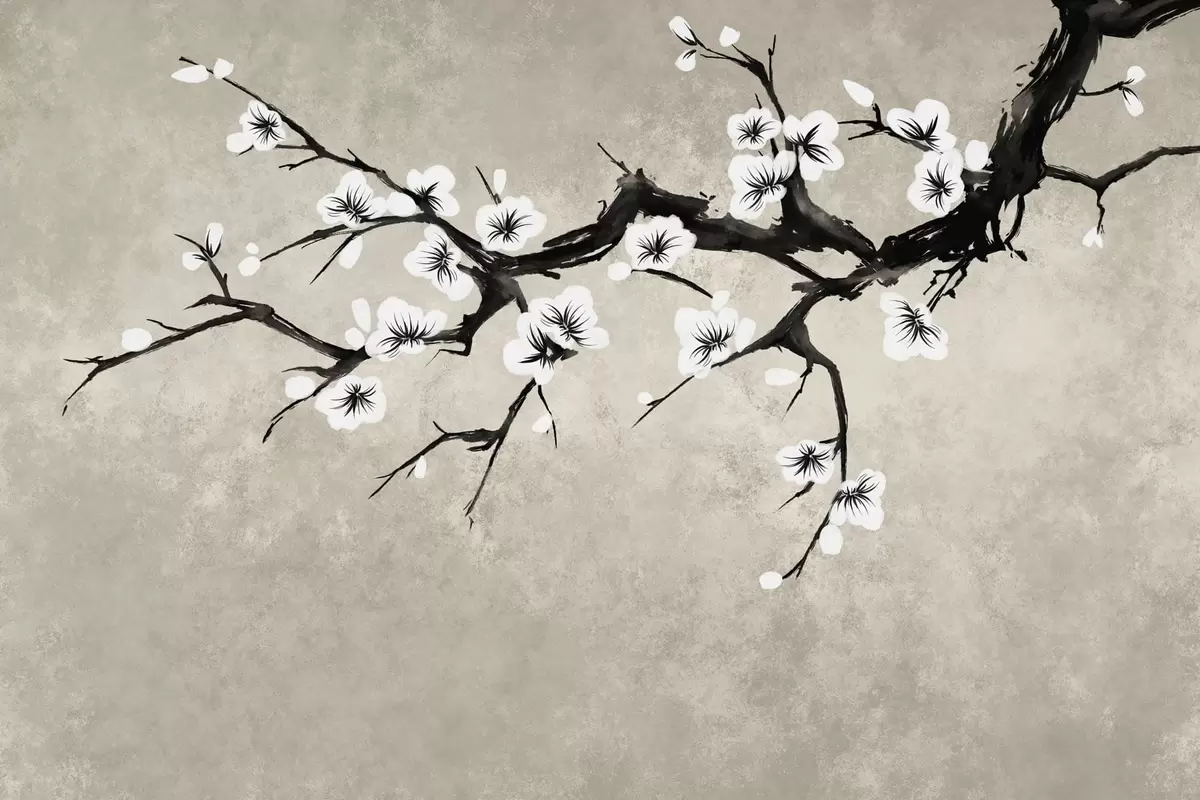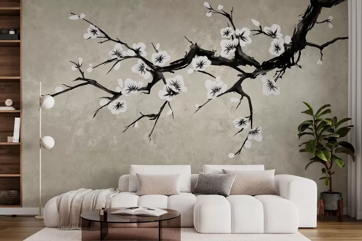 Valokuvatapetti Valkoisia kukkia kantaava oksa minimalistisessa tyylissä Nr w05425