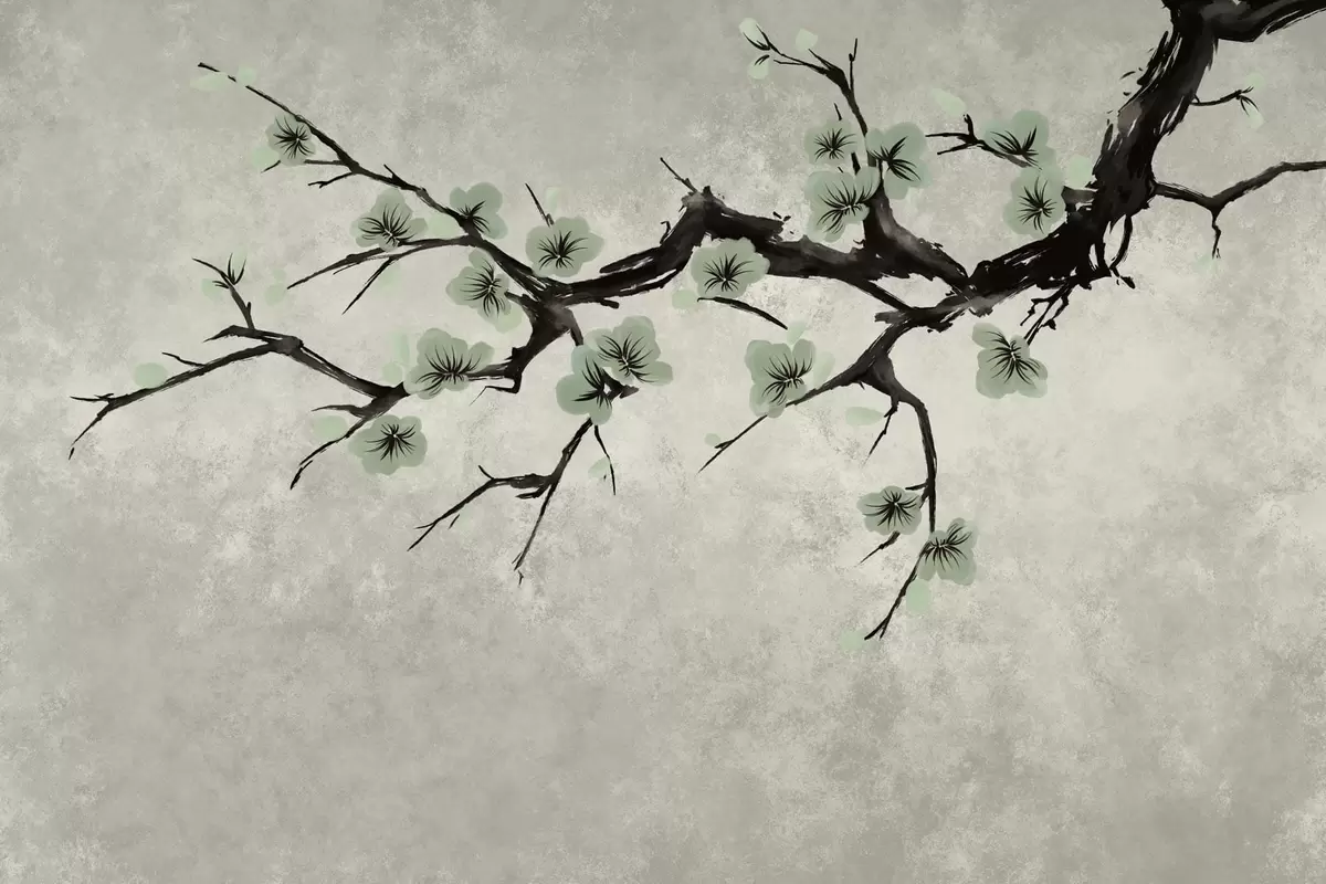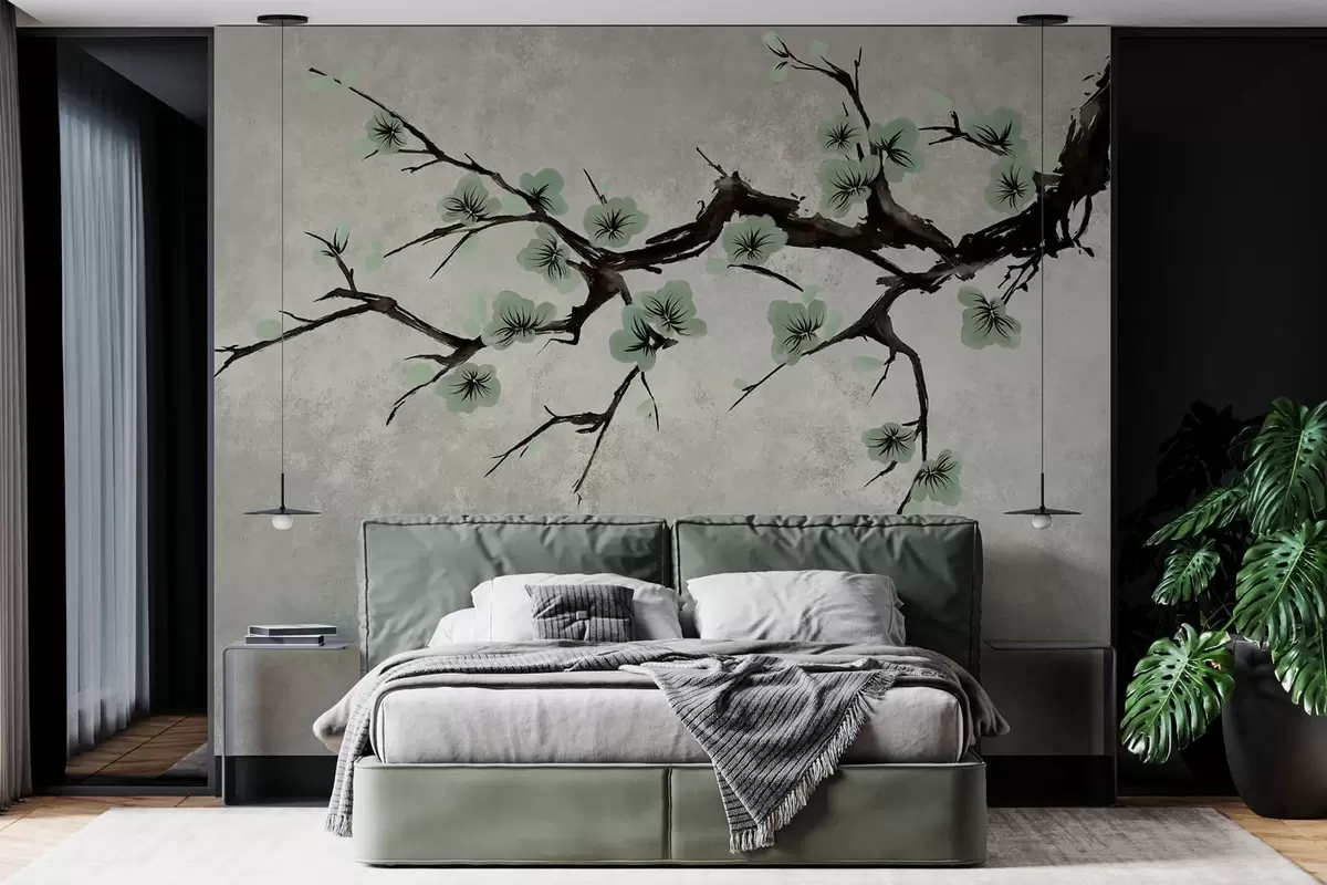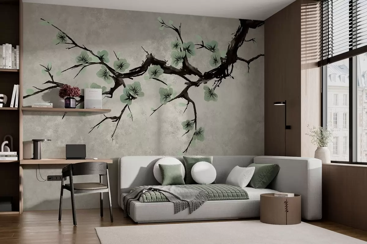 Valokuvatapetti Oksa, jossa on vihreitä kukkia rauhallisissa sävyissä Nr w05425v2