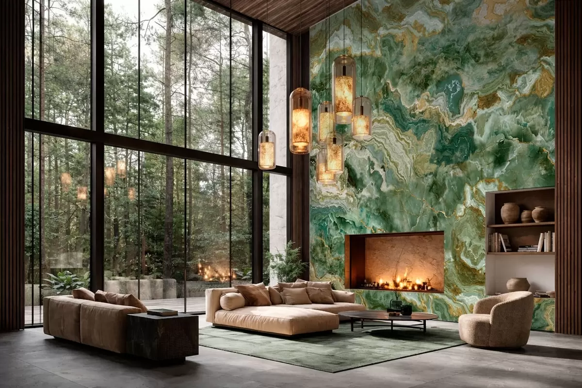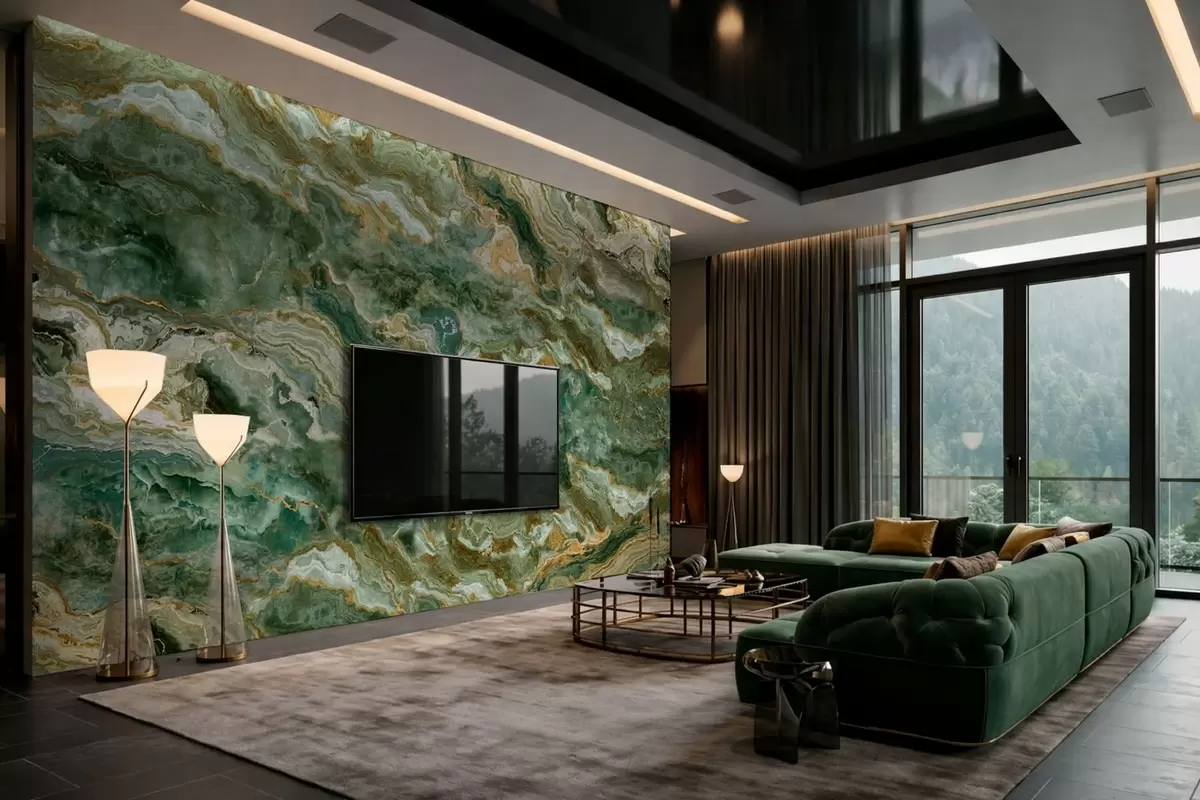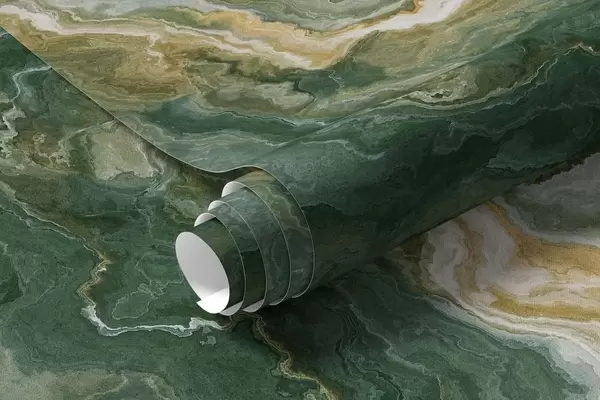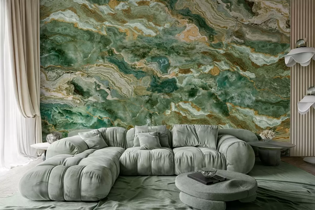 Valokuvatapetti Vihreän onyxin tekstuuri, jossa on virtaavia, kerroksellisia suonia Nr w05429